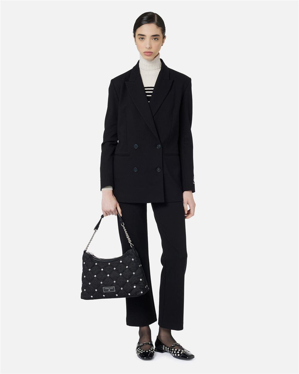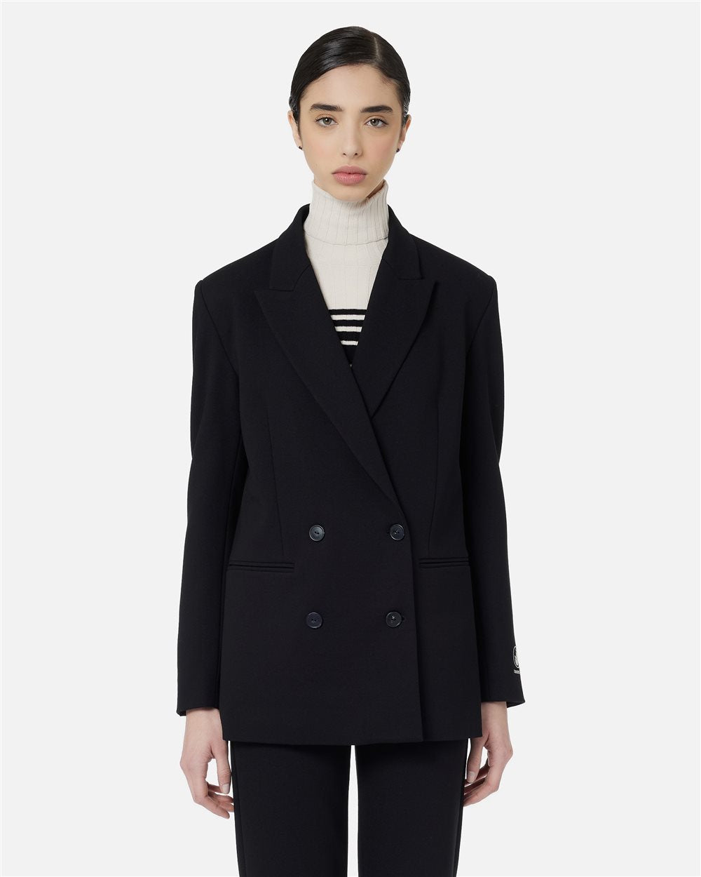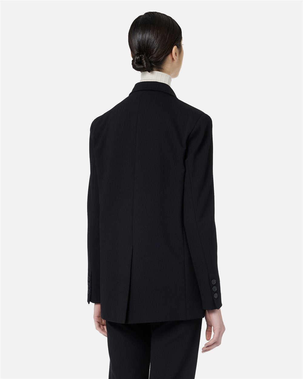 Elegância e modernidade se encontram neste casaco trespassado confeccionado em ponto Milano elástico preto, projetado para um ajuste sob medida e confortável. Os botões com o logotipo de chifre falso adornam a parte central da frente e os punhos, enquanto os bolsos embutidos nas laterais mantêm um design clean e funcional. O logotipo IJ bordado no punho esquerdo adiciona um toque refinado da identidade Iceberg.