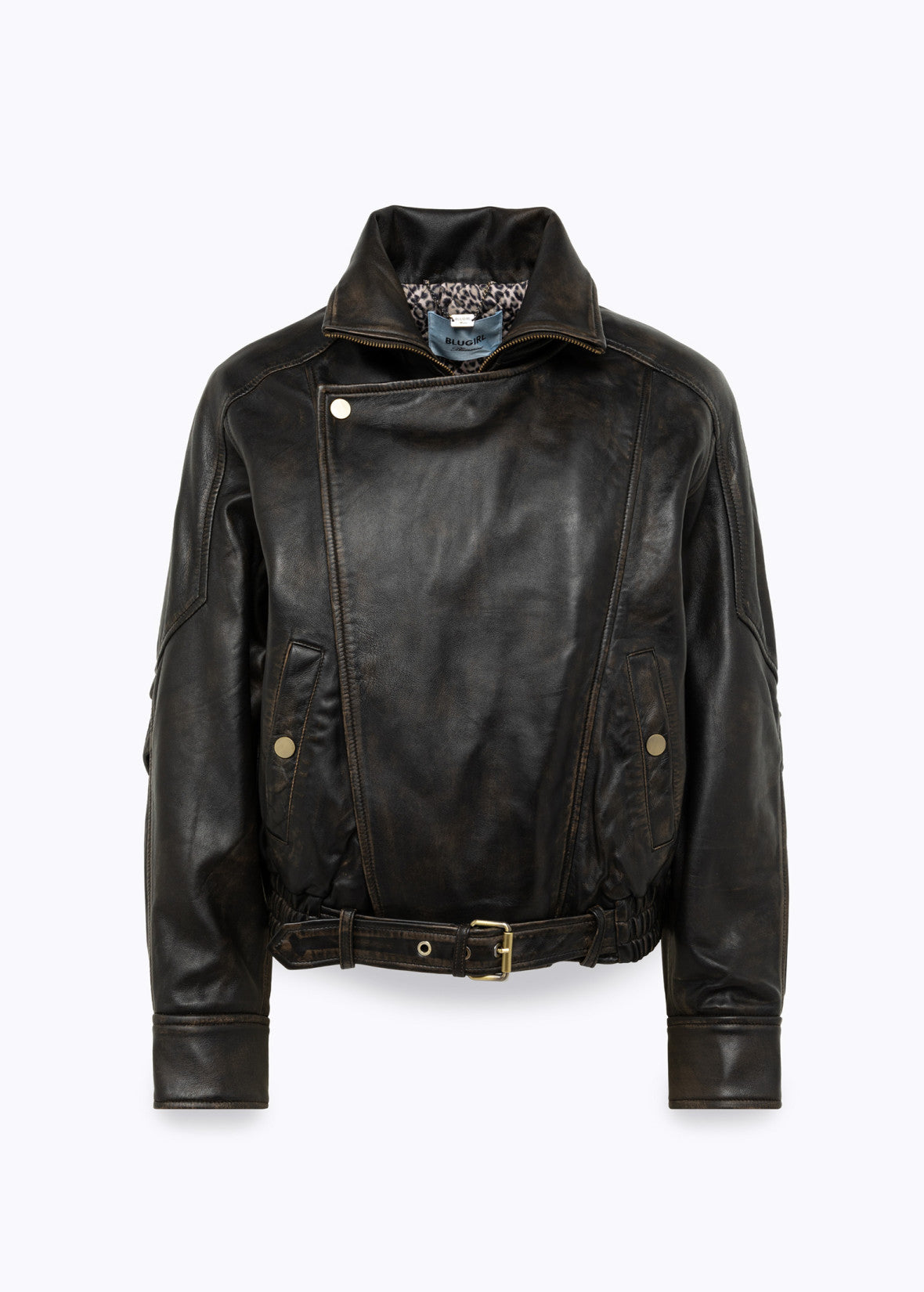 Blusão de gola alta, fechamento de zíper assimétrico coberto por aba, cinto na parte inferior, bolsos laterais com aba e botões de pressão, magas compridas com punho e botões, forro com bolinhas e silhueta macia.