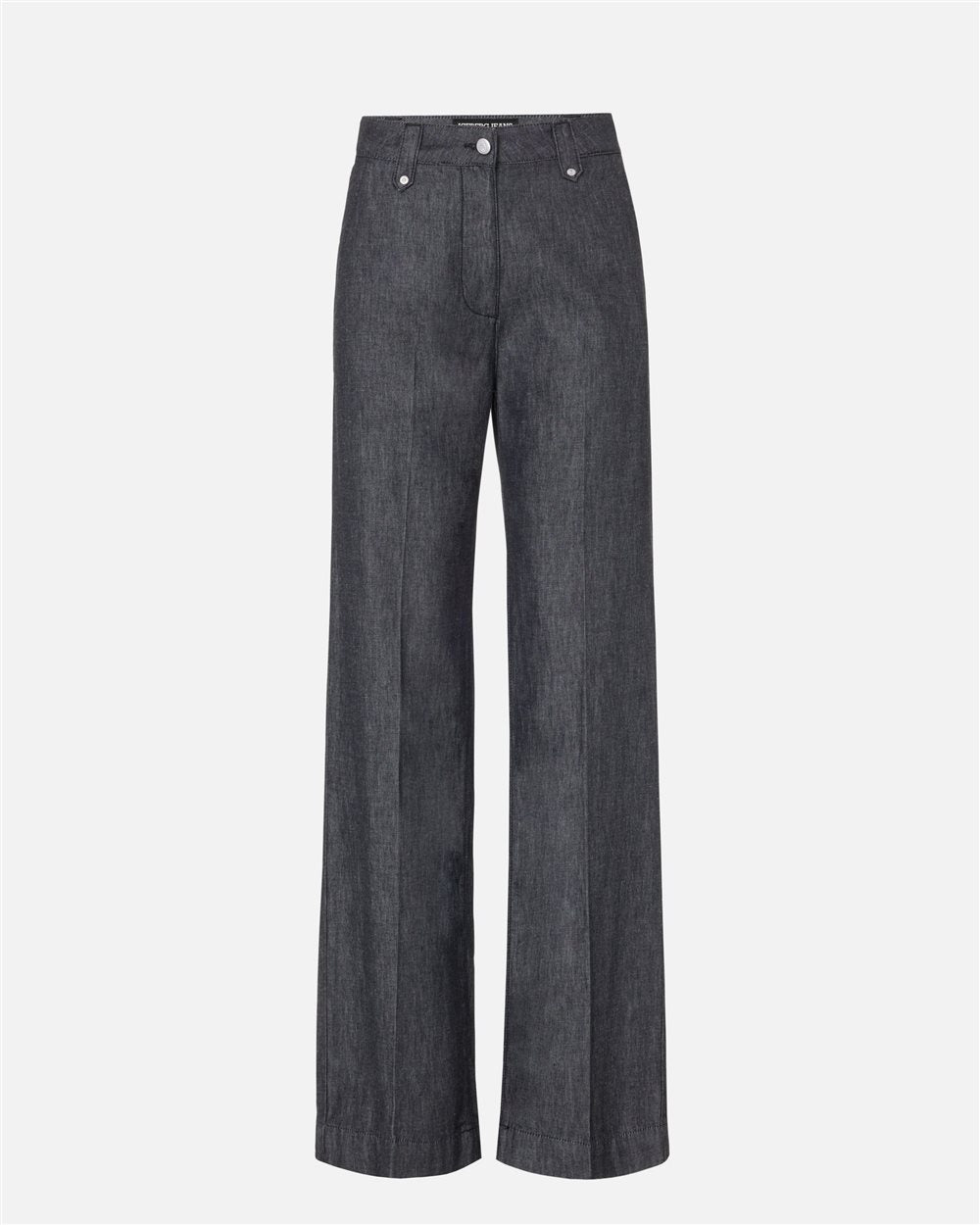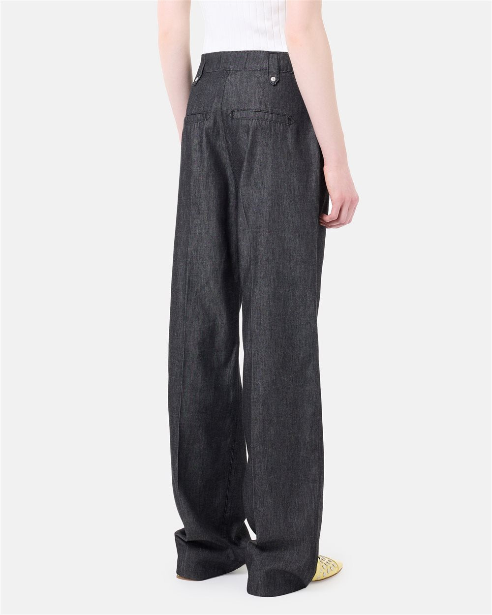 Calças estilo Nova Iorque em chambray de algodão preto, caracterizadas por um corte contemporâneo e atenção aos detalhes. O fecho com botão metálico com a marca define o design com um toque arrojado, enquanto os passadores de cinto com acabamento em rebites da marca acrescentam um detalhe distintivo inspirado no vestuário de trabalho. O acabamento em viés na parte de trás completa o modelo, tornando-o uma peça versátil, concebida para interpretar o guarda-roupa urbano do dia a dia com personalidade.