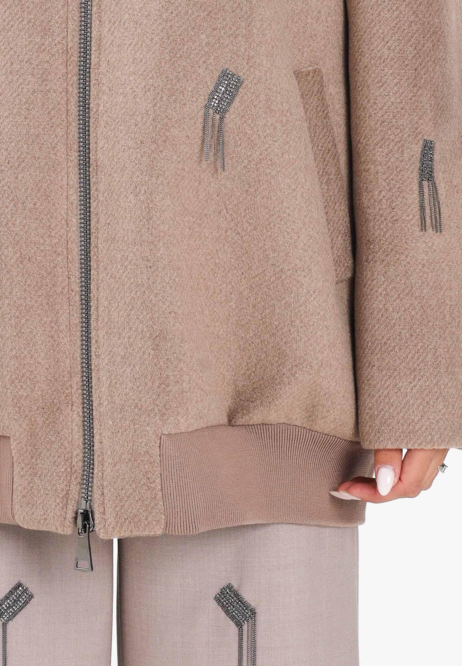 Casaco oversized, fecho frontal com zíper bidirecional e gola bomber canelada tom sobre tom, adicionando um toque casual. As mangas longas e o caimento solto garantem conforto e liberdade de movimentos, enquanto a bainha canelada adiciona estrutura à silhueta. O detalhe marcante são os apliques bordados com pequenas franjas brilhantes, distribuídos por toda a superfície do casaco, criando um efeito luminoso e original. Dois bolsos laterais de debrum práticos e funcionais completam o look.