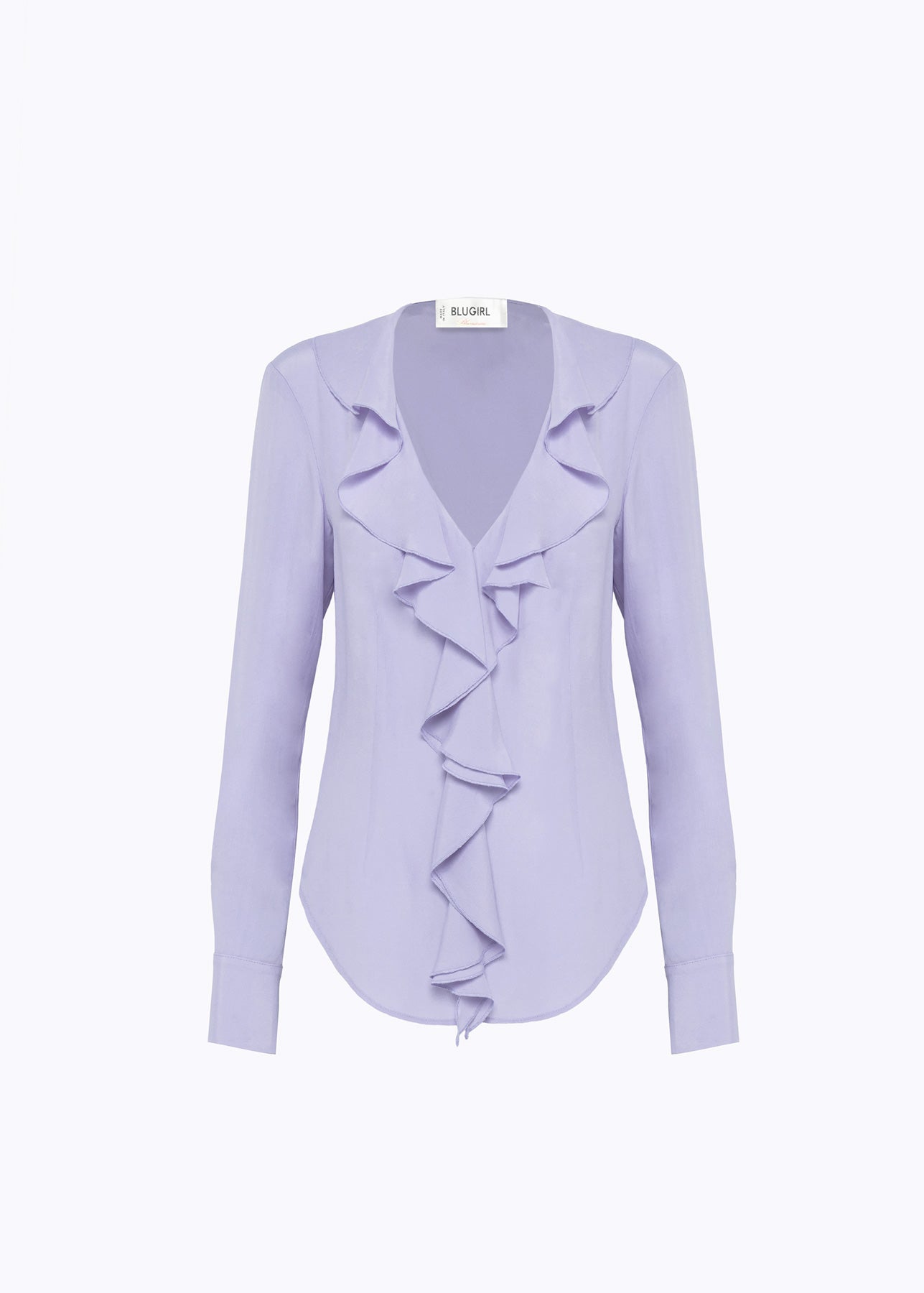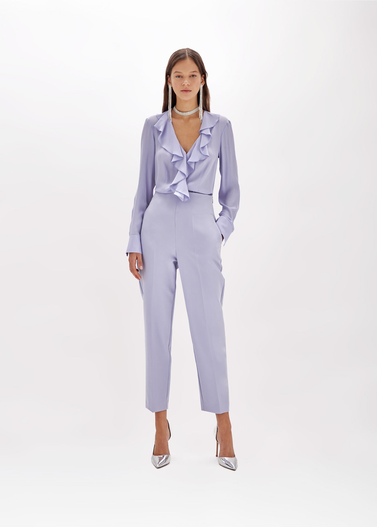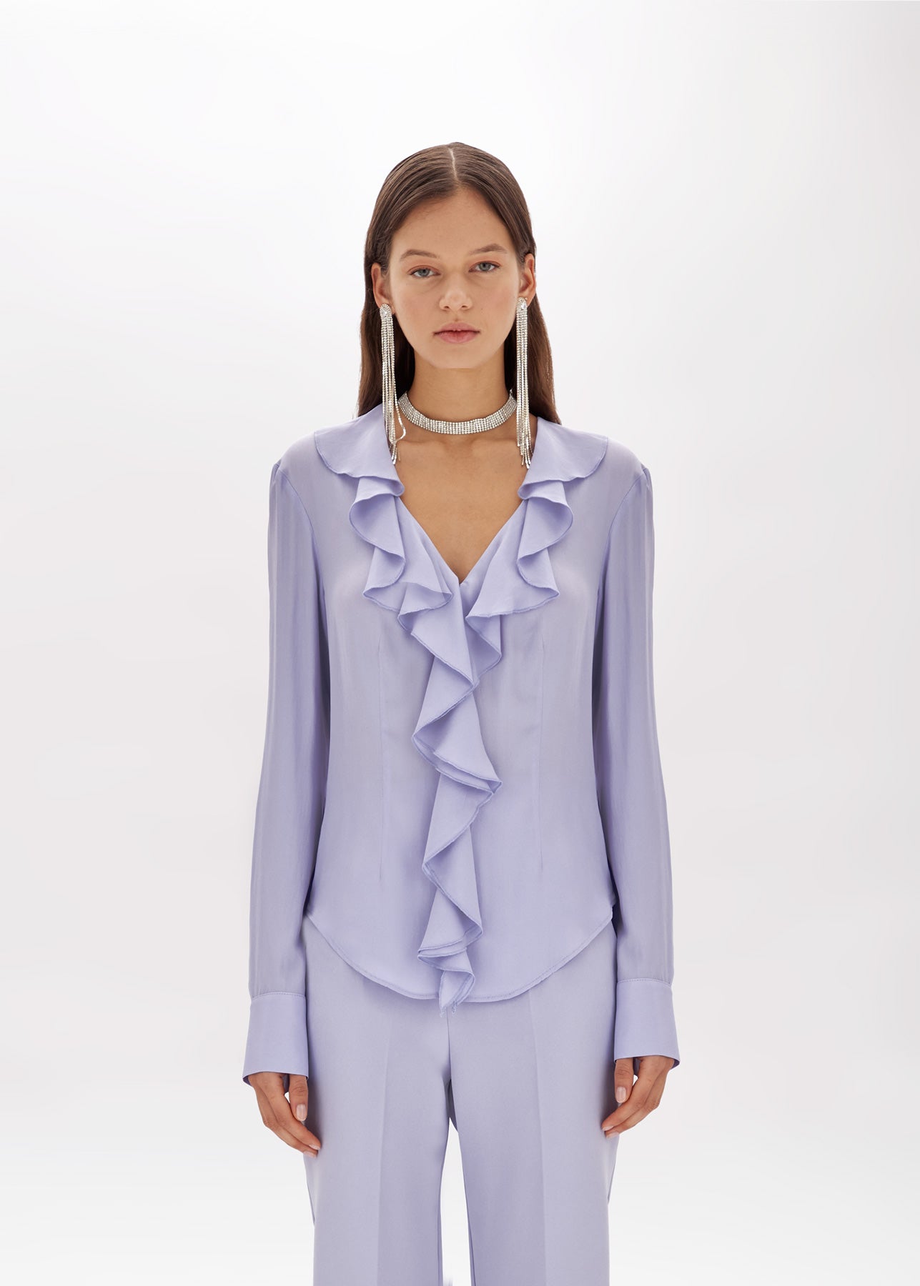 Blusa em cetim, cor sólida, aplicações contrastantes, gola em V com folho, manga comprida, fecho lateral de zip, sem forro.