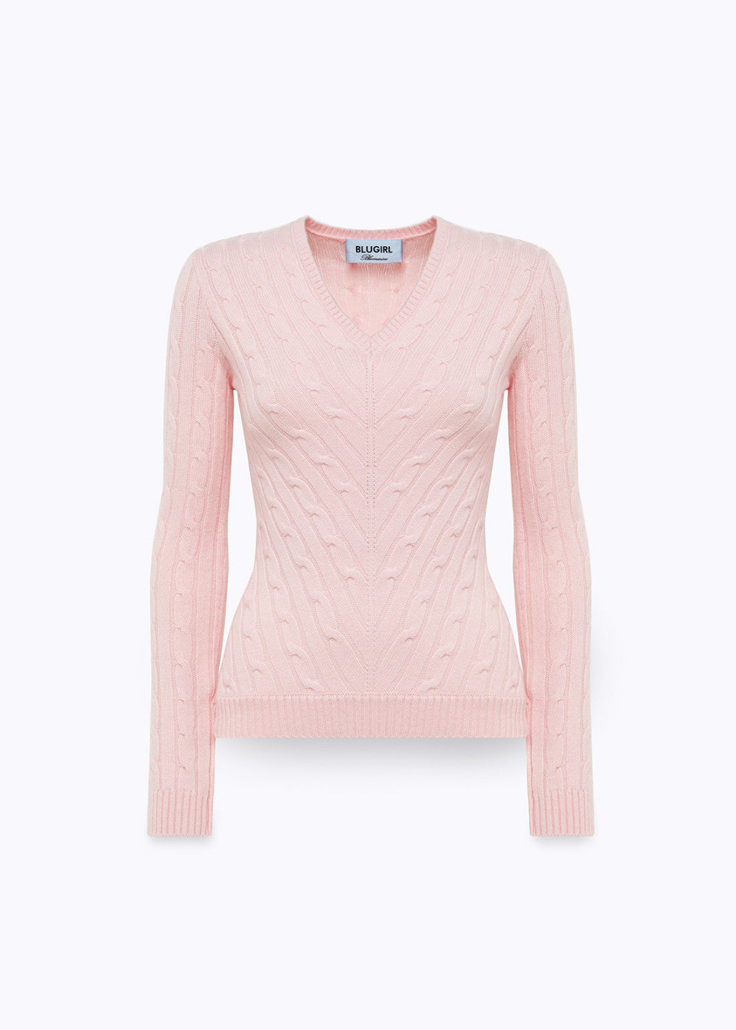 Malha diagonal com decote em V, mangas compridas e costas com trabalho contrastante, cintura justa.