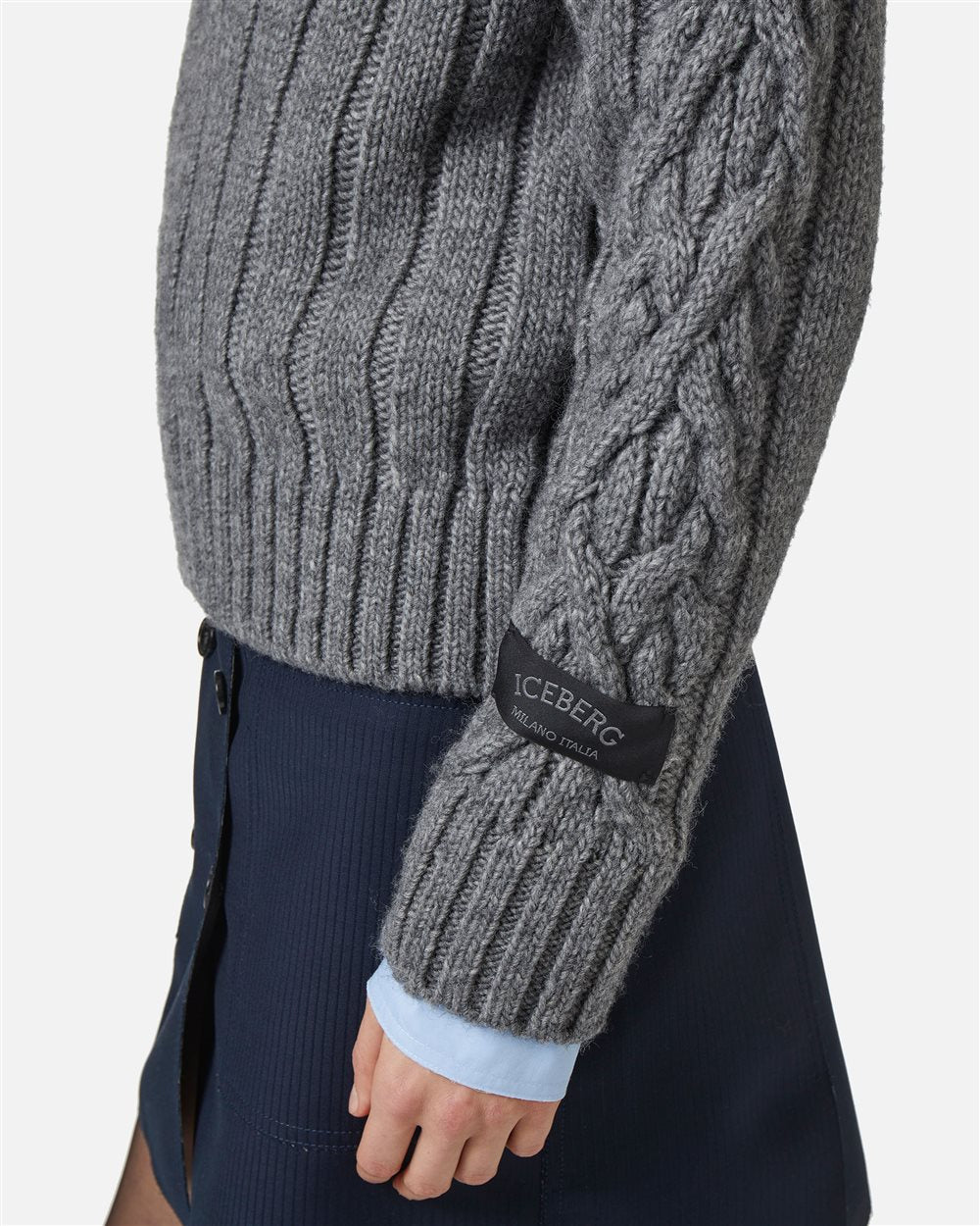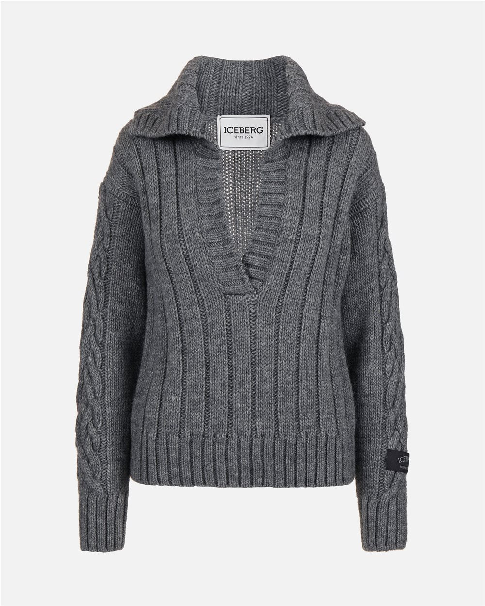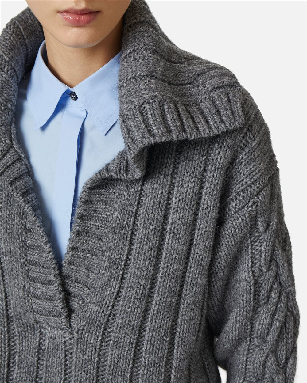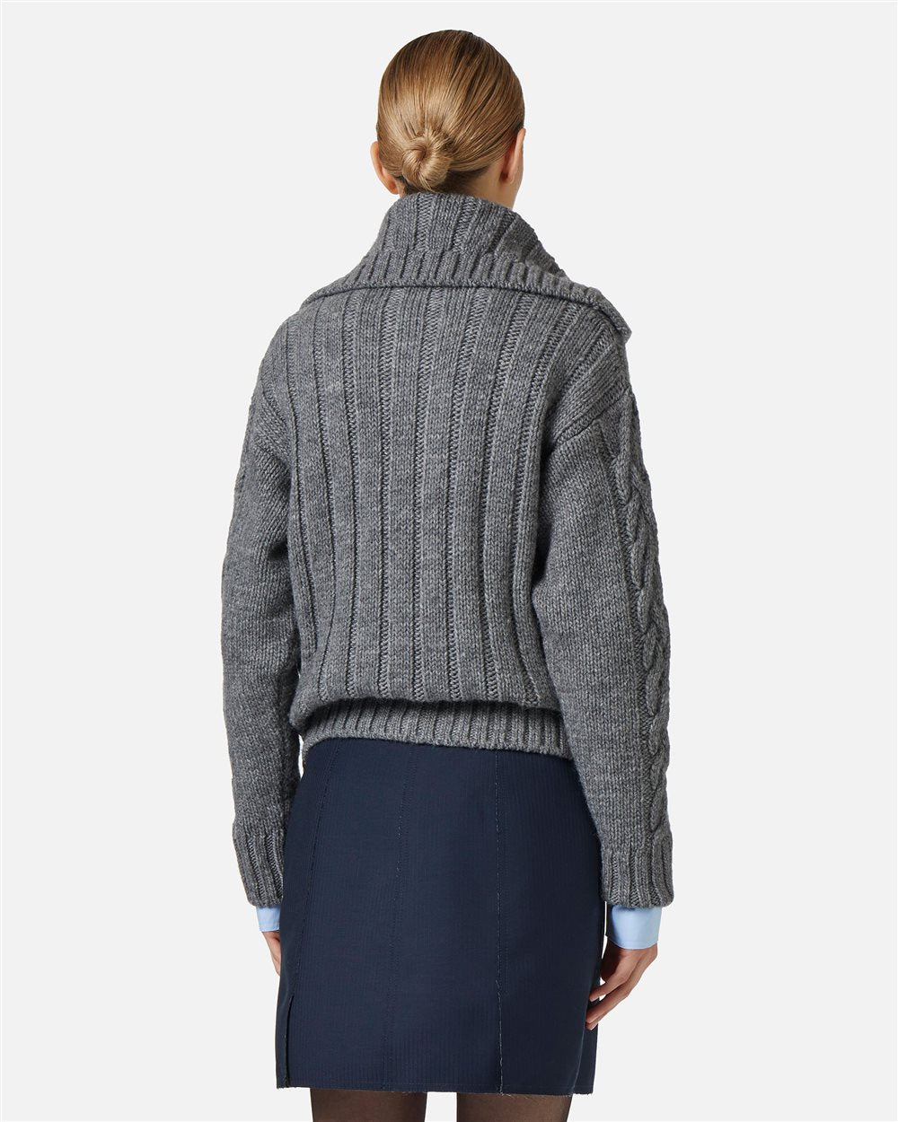 Este suéter polo em mistura de lã e alpaca revisita o clássico com um jogo refinado de volumes e acabamentos. O busto largo canelado encontra uma gola desbalanceada, também canelada, para um toque assimétrico e contemporâneo. As mangas são trabalhadas com uma trança central e laterais raspadas, enquanto os acabamentos canelados 2x1 na barra e nos punhos completam o look com equilíbrio. A nuance cinza mescla realça a materialidade da peça, perfeita para realçar um estilo sofisticado e não convencional.