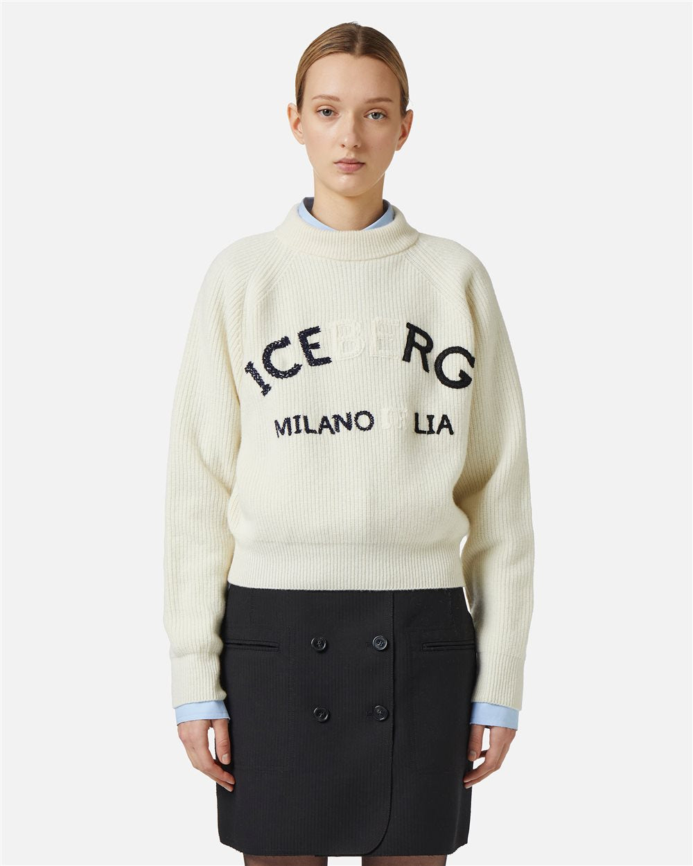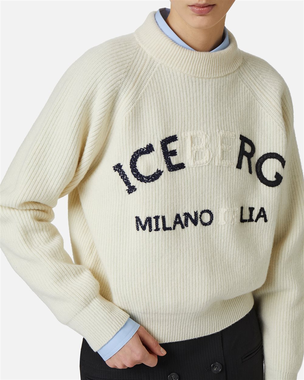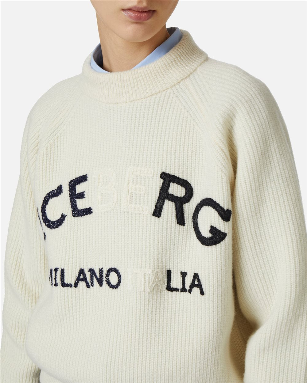 Um clássico reinterpretado com personalidade: este suéter de gola redonda branco leitoso é confeccionado em lã de cordeiro com ponto milho e estrutura caída. Na frente, o bordado iceberg milano italia em cor contrastante apresenta um símbolo gráfico ousado, perfeito para expressar a identidade da marca com energia contemporânea. Uma peça quente e estruturada, projetada para se destacar.