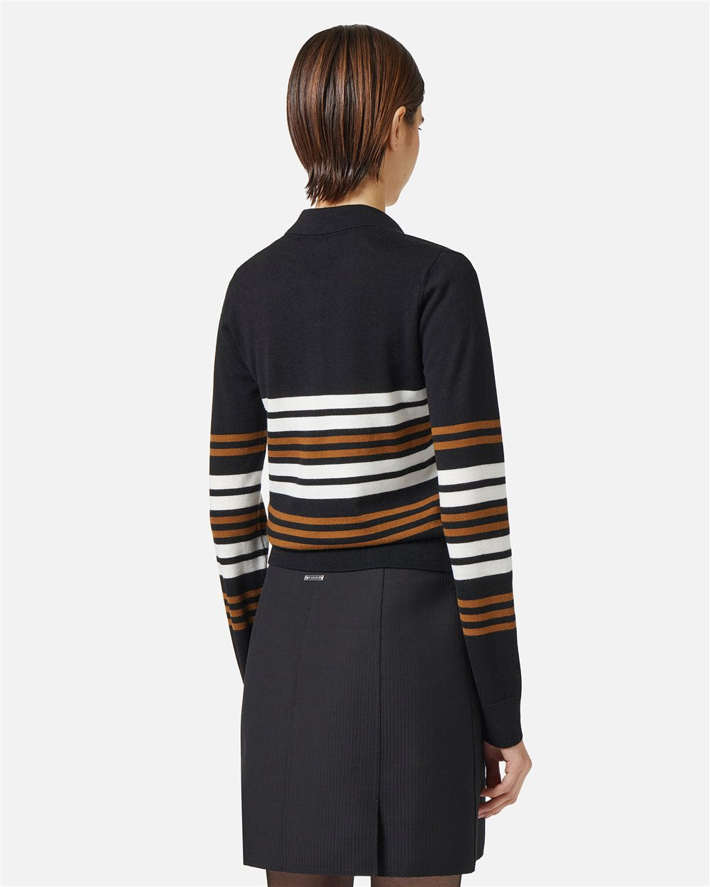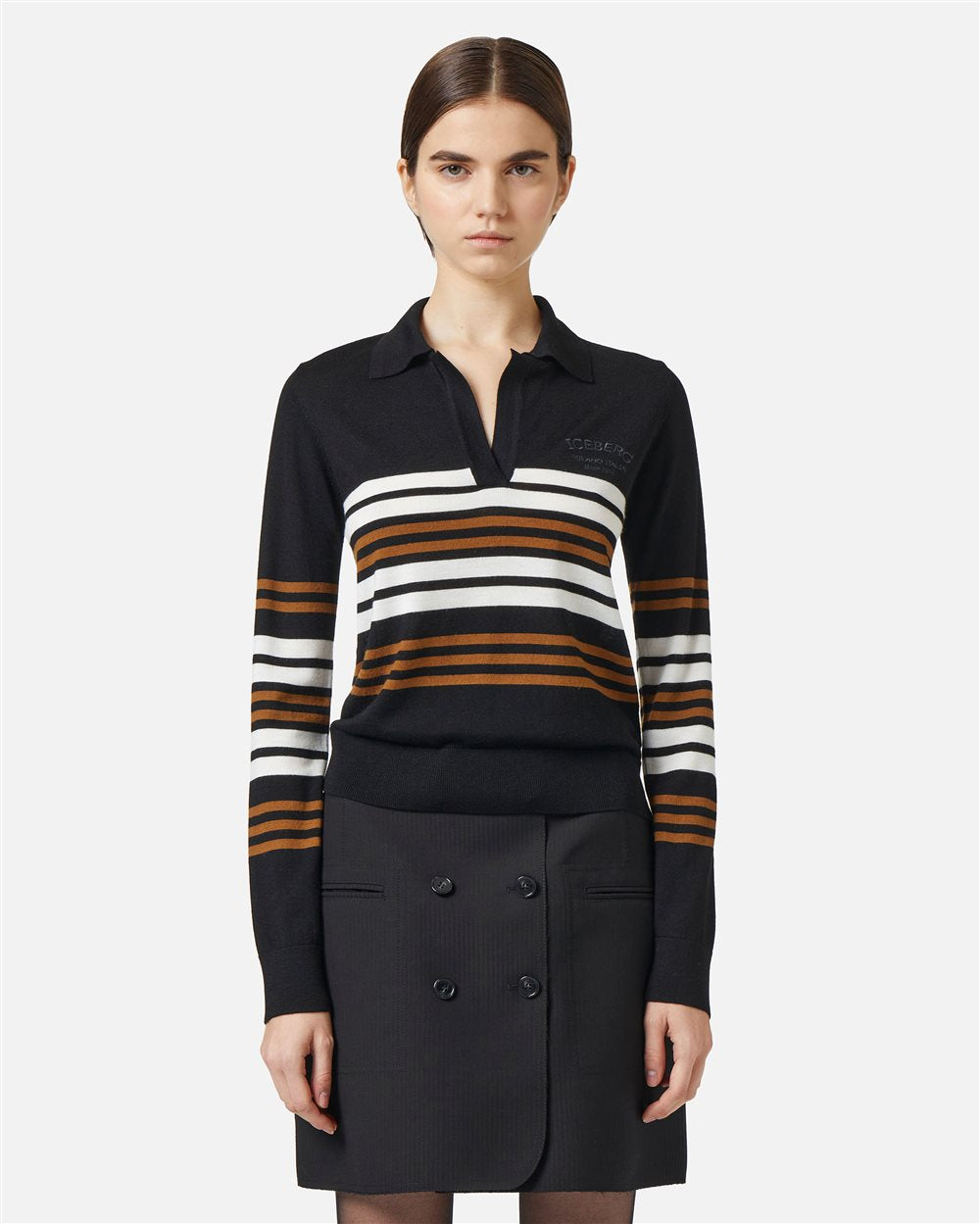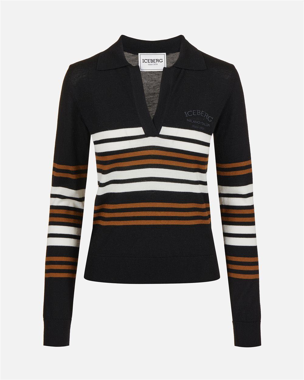 Polo estampada de manga comprida que combina a maciez da lã merino extrafina com um design versátil, disponível em duas versões: listrada lisa e lisa com frentes caídas. O detalhe de personalização tom sobre tom Iceberg Milano enriquece a peça, conferindo-lhe uma elegância discreta e moderna.