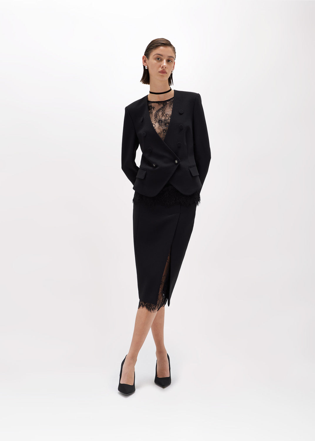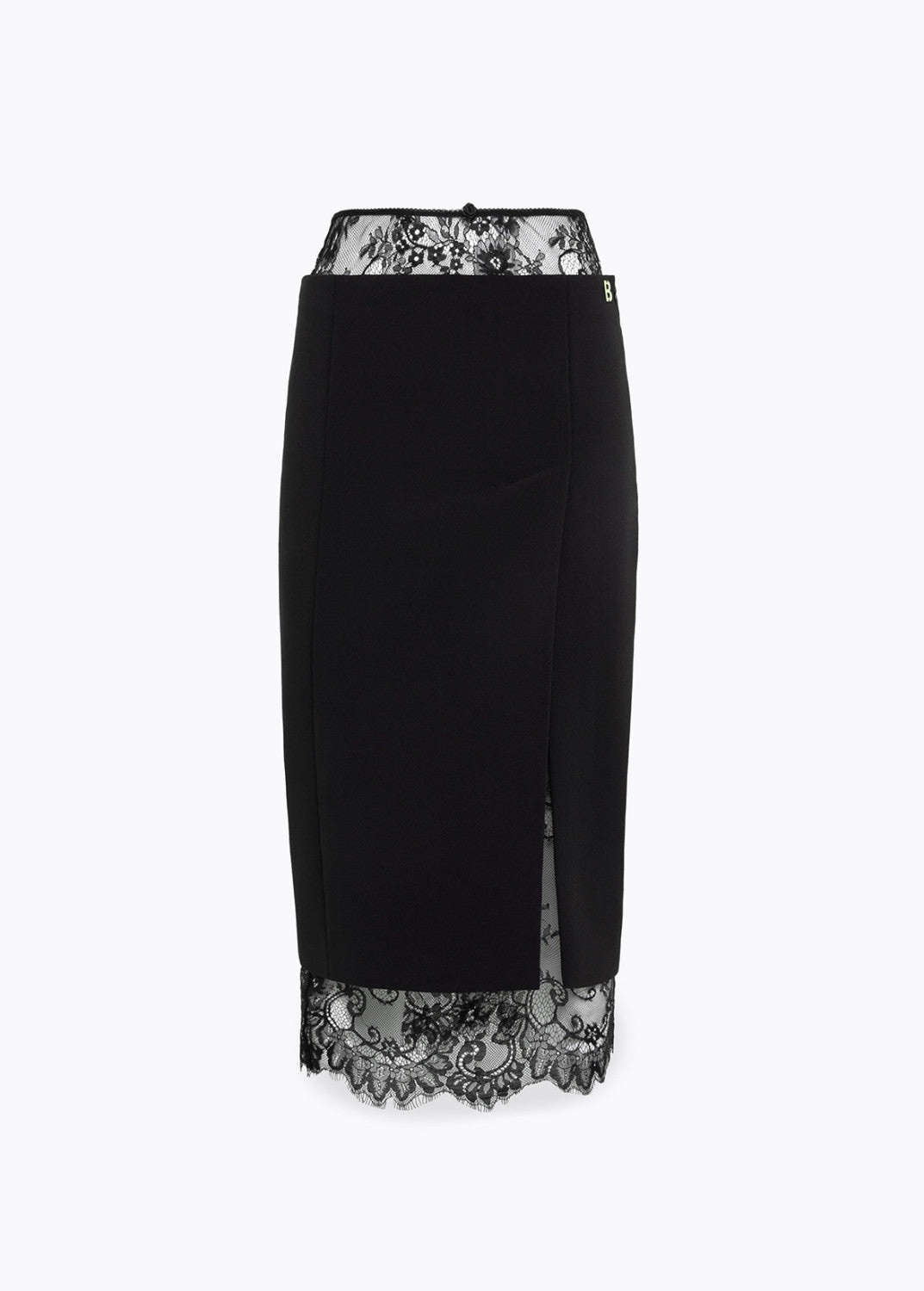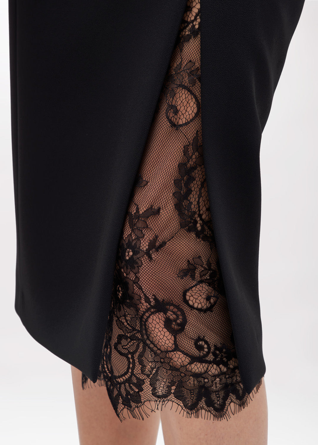 Saia em crêpe leve e elástica com zíper lateral, fenda lateral e saia de baixo de renda removível com botões, Ideãl para elevar qualquer look formal e além disso.