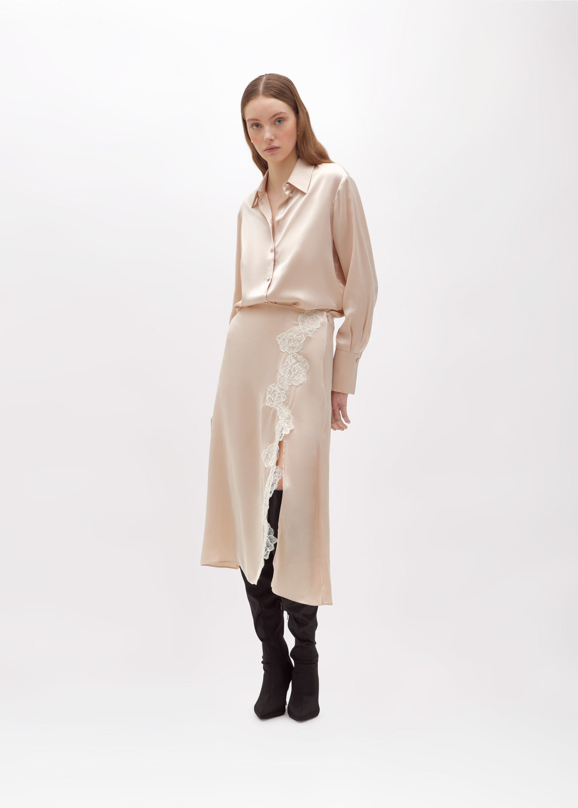 Saia de cetim seda, com aolicações de renda floral em formato de rosa. Apresenta fechamento lateral com zíper, uma rachadura definida por renda e uma silhueta levemente aberta.