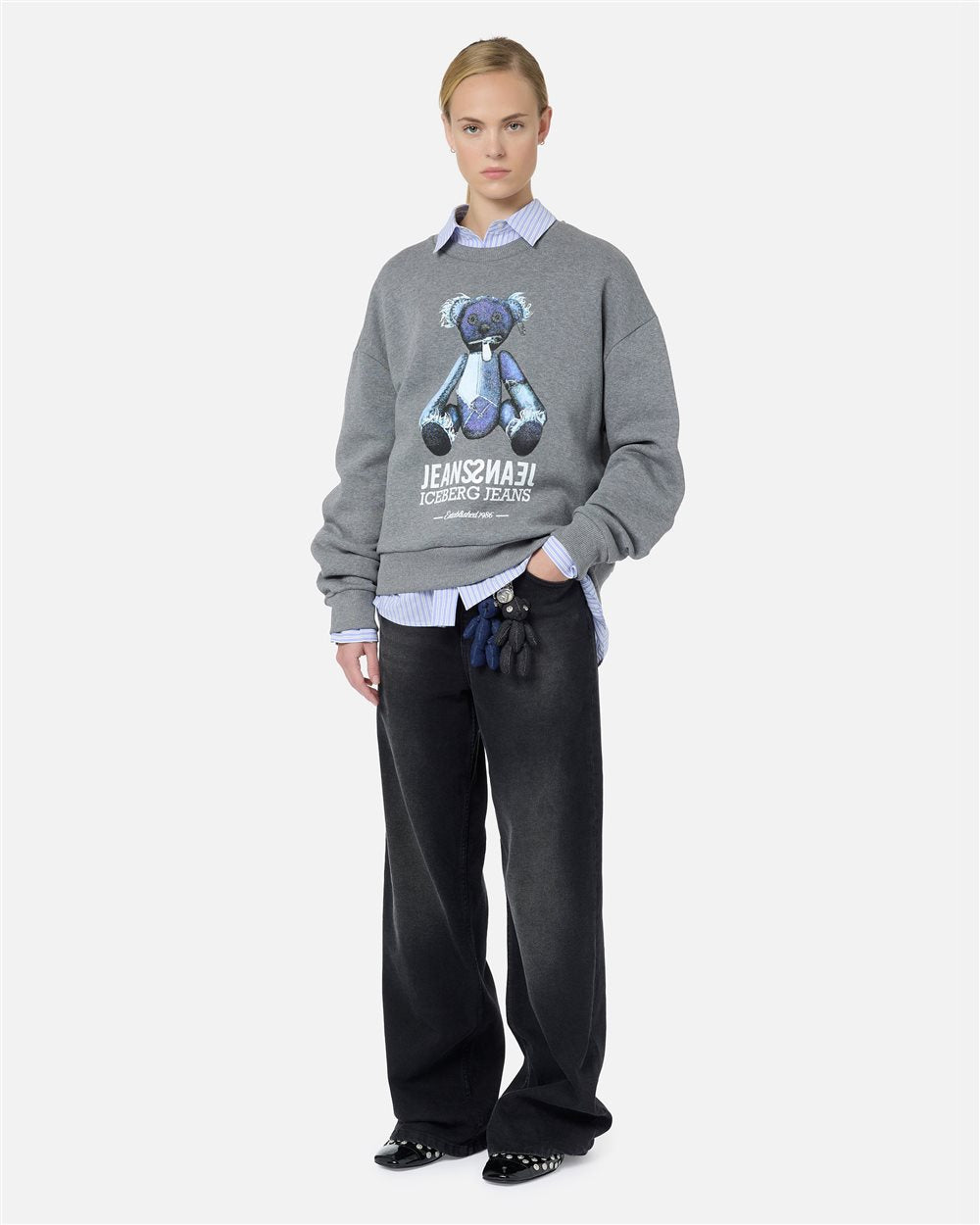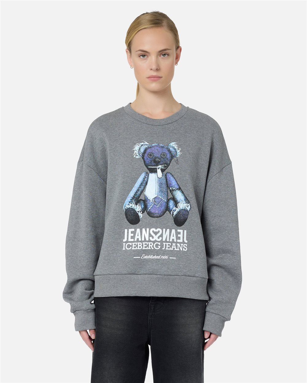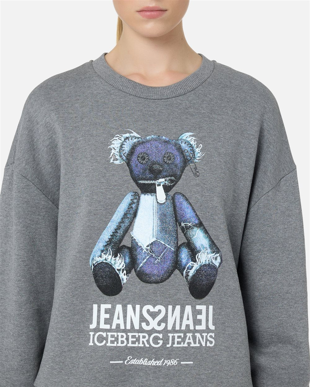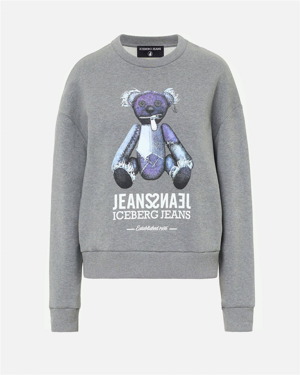 Confecionado em fleece de algodão escovado cinza mesclado, este suéter de gola redonda com modelagem regular combina conforto e um espírito descontraído. O design é finalizado com gola, punhos e bainha canelados, enquanto a estampa central com um ursinho de pelúcia com efeito jeans confere à peça um toque icônico e divertido, no estilo perfeito do Iceberg.
