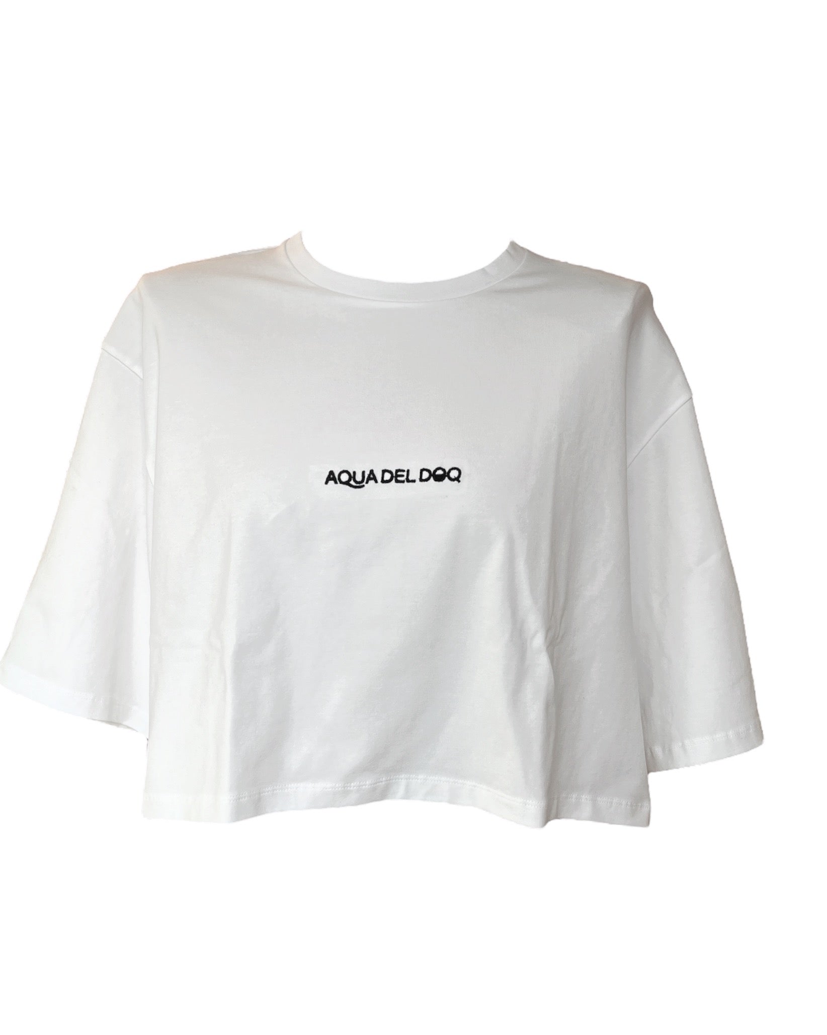 T-shirt em algodão estilo cropped, cor sólida básica, logótipo, gola redonda, manga curta, oversize.