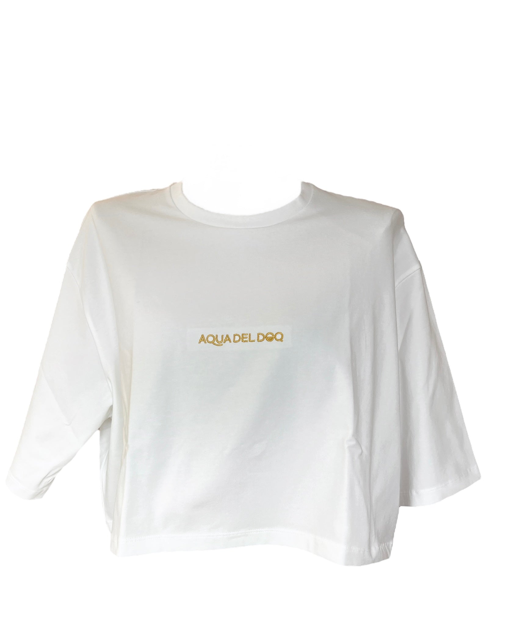 T-shirt em algodão estilo cropped, cor sólida básica, logótipo, gola redonda, manga curta, oversize.