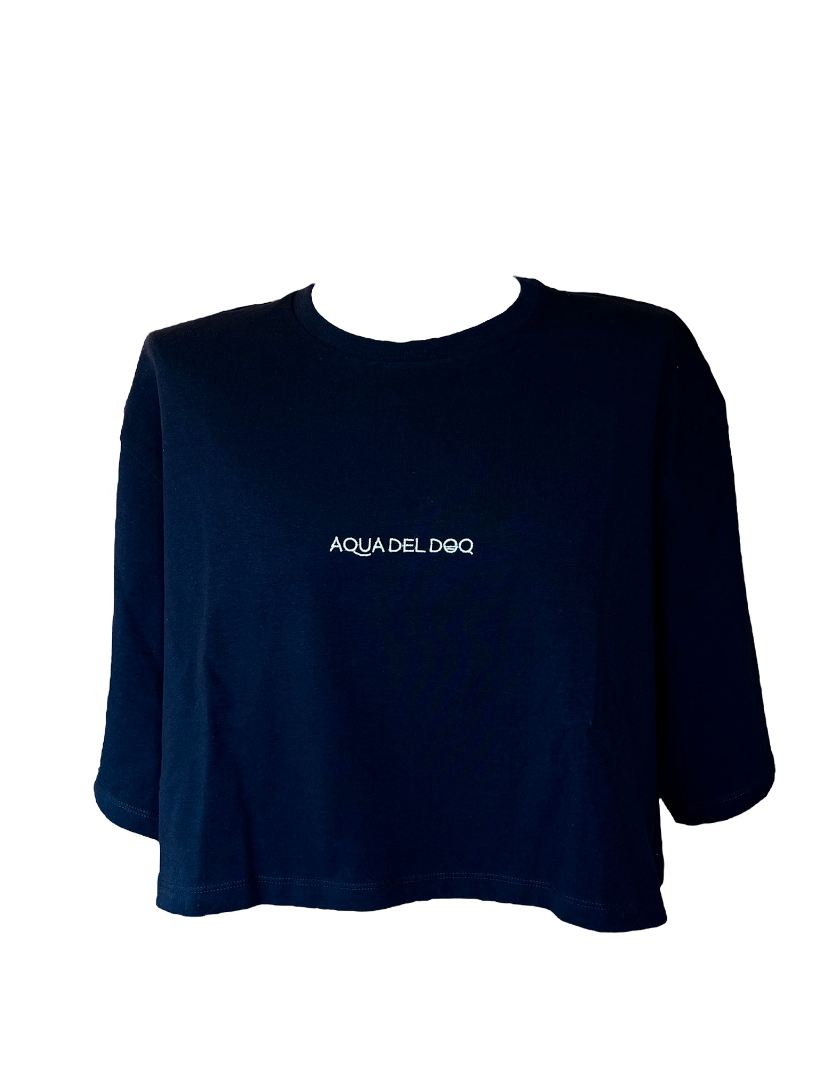 T-shirt em algodão estilo cropped, cor sólida básica, logótipo, gola redonda, manga curta, oversize.