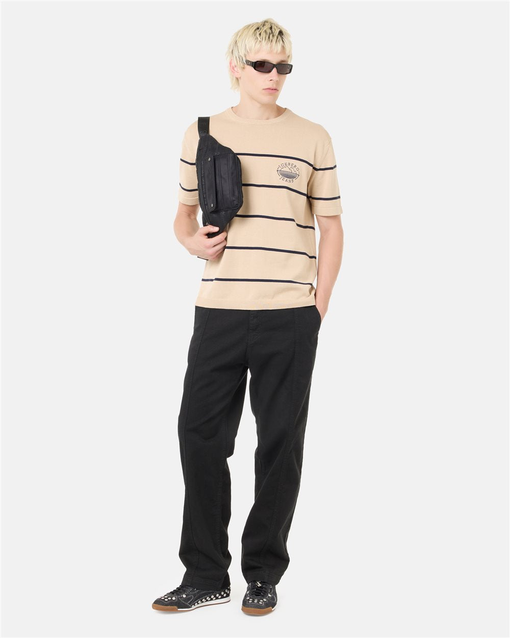 Suéter de gola redonda em puro algodão bege claro, tricotado em malha lisa de calibre 12 para um toque macio e um caimento equilibrado. Listras contrastantes definem o design com um ritmo gráfico essencial, enquanto o bordado da marca com um motivo de montanha ao centro introduz um detalhe distintivo. Gola, punhos e barra canelados completam o modelo, concebido para um look casual contemporâneo refinado.