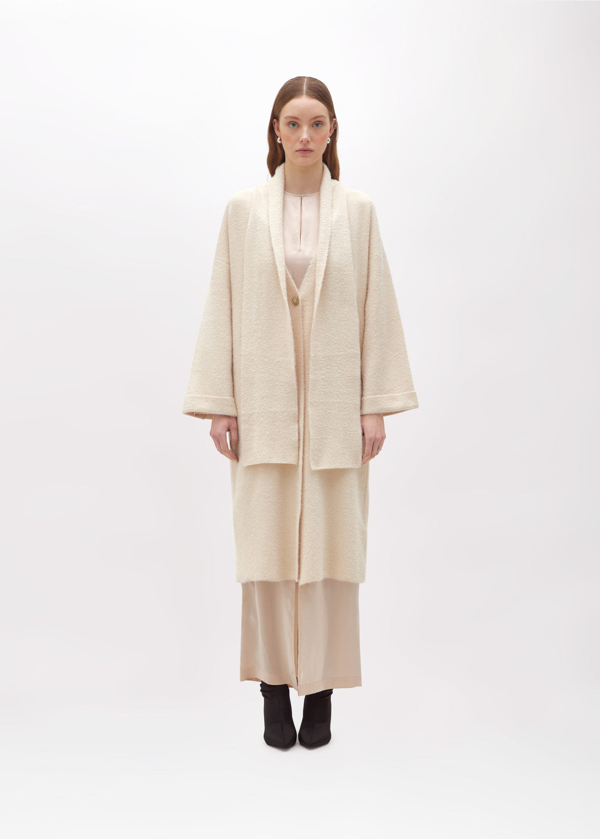 Sofisticado, dramático, confortável. Cardigan Oversize com efeito de pele e gola cachecol. Decote em V, fechamento com botões de joia, mangas longas e largas com punho.