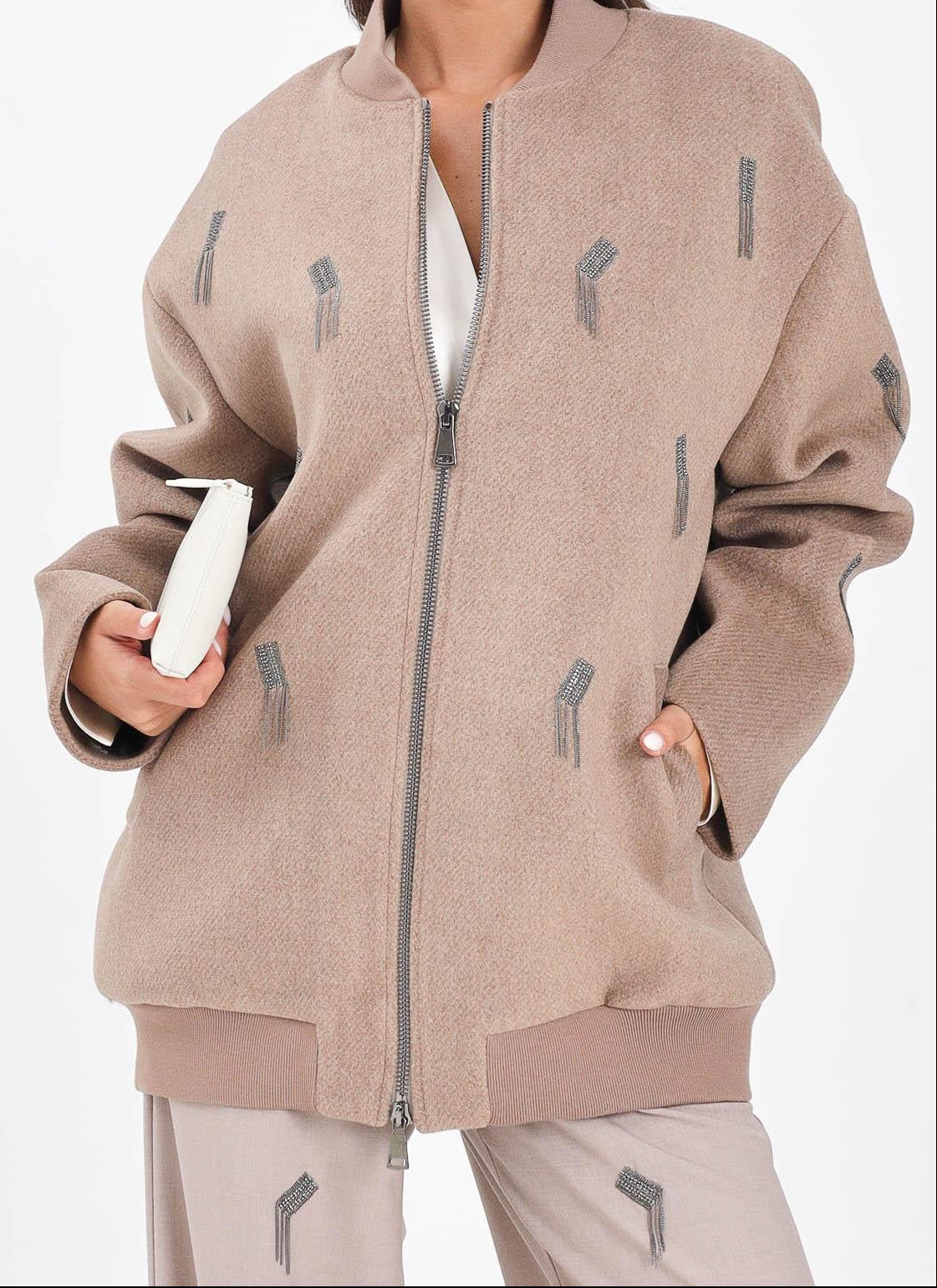 Casaco oversized, fecho frontal com zíper bidirecional e gola bomber canelada tom sobre tom, adicionando um toque casual. As mangas longas e o caimento solto garantem conforto e liberdade de movimentos, enquanto a bainha canelada adiciona estrutura à silhueta. O detalhe marcante são os apliques bordados com pequenas franjas brilhantes, distribuídos por toda a superfície do casaco, criando um efeito luminoso e original. Dois bolsos laterais de debrum práticos e funcionais completam o look.