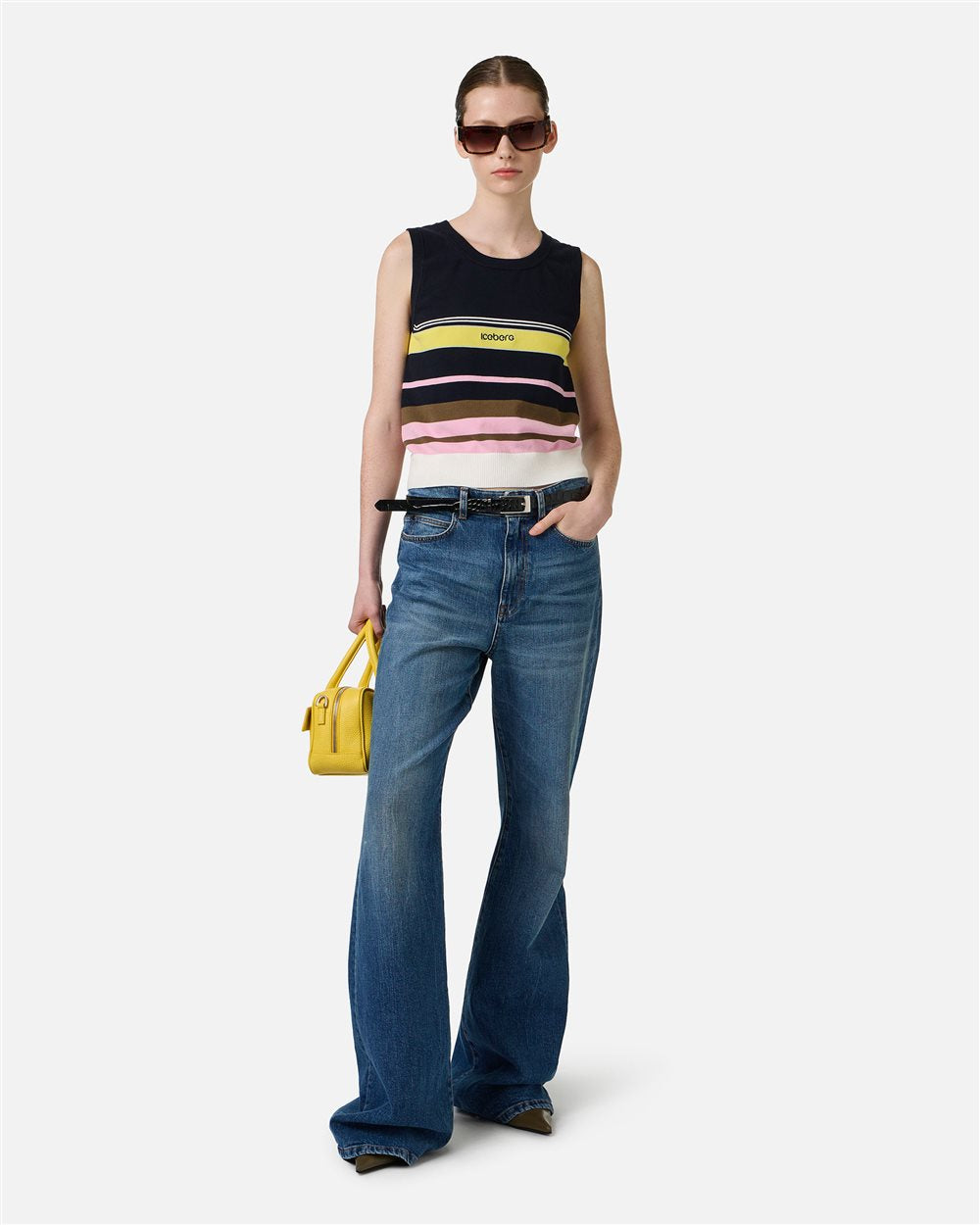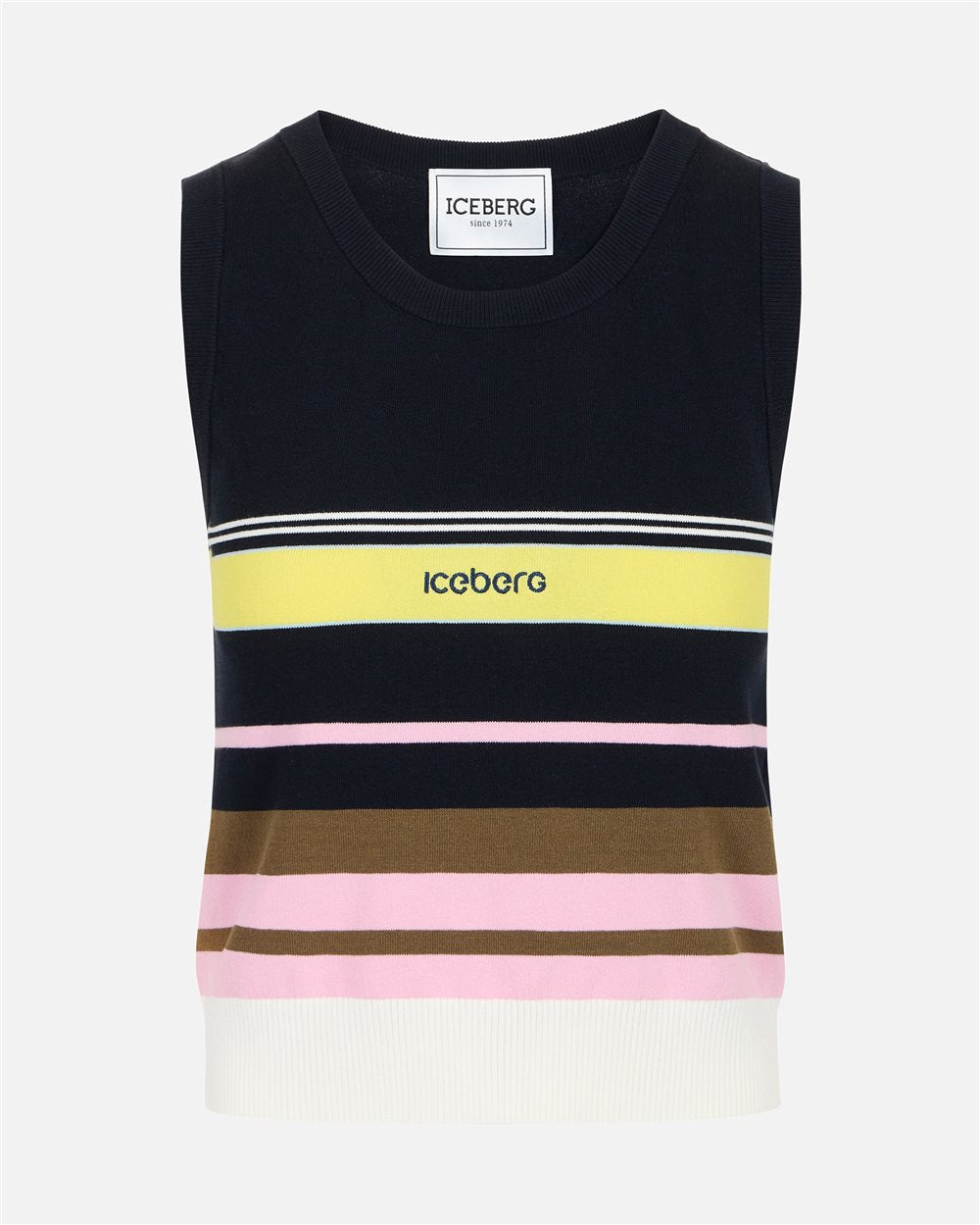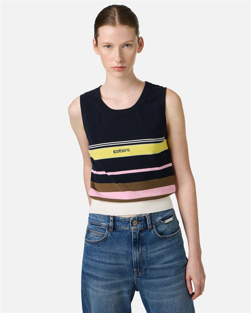 Top de algodão stretch com estampa de listras multicoloridas e detalhes em cores sólidas, definido por bordas contrastantes que conferem um toque gráfico contemporâneo. A estrutura compacta acompanha o caimento naturalmente, enquanto o logo Iceberg bordado em contraste adiciona um toque de assinatura. Um modelo essencial e dinâmico, criado para complementar looks urbanos com personalidade marcante.