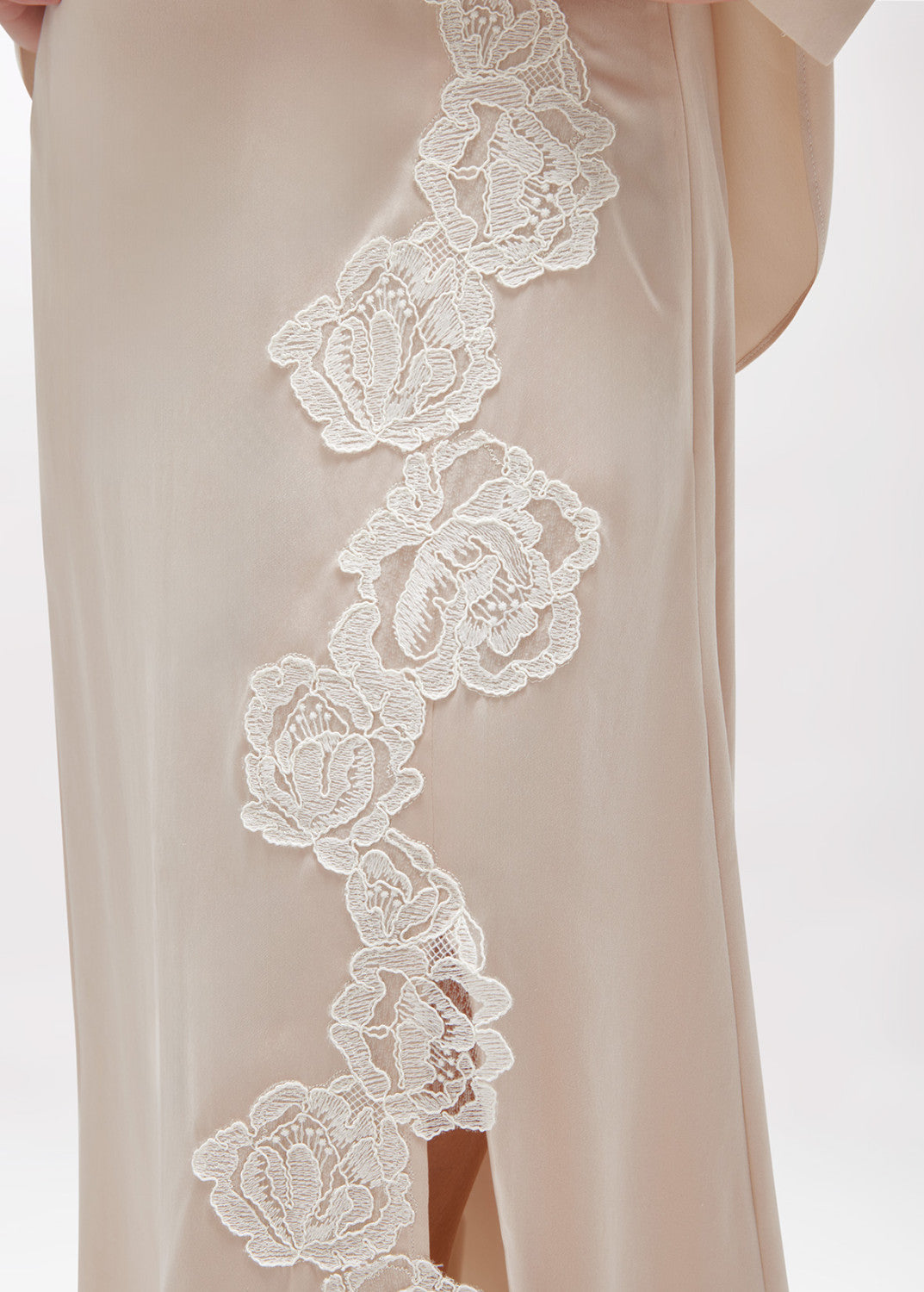 Saia de cetim seda, com aolicações de renda floral em formato de rosa. Apresenta fechamento lateral com zíper, uma rachadura definida por renda e uma silhueta levemente aberta.