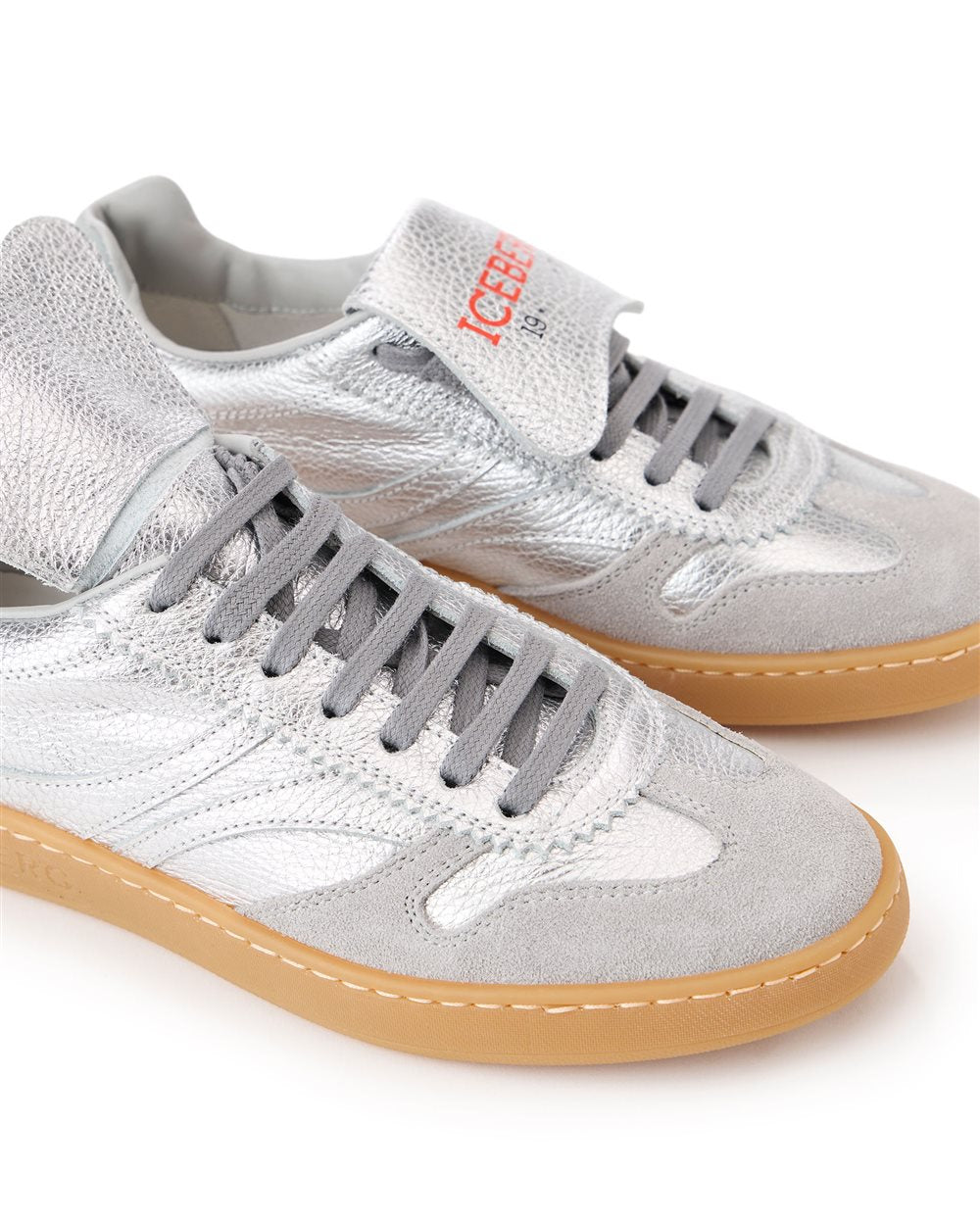 A nova construção "California" do Iceberg é uma homenagem às chuteiras de futebol vintage dos anos 70. O solado cor de mel e a língua com o logotipo conferem ao tênis um autêntico toque retrô, em perfeita sintonia com as tendências atuais. A cor prateada combina facilmente com looks mais casuais, adicionando um caráter ousado e marcante com um toque vintage irresistível.