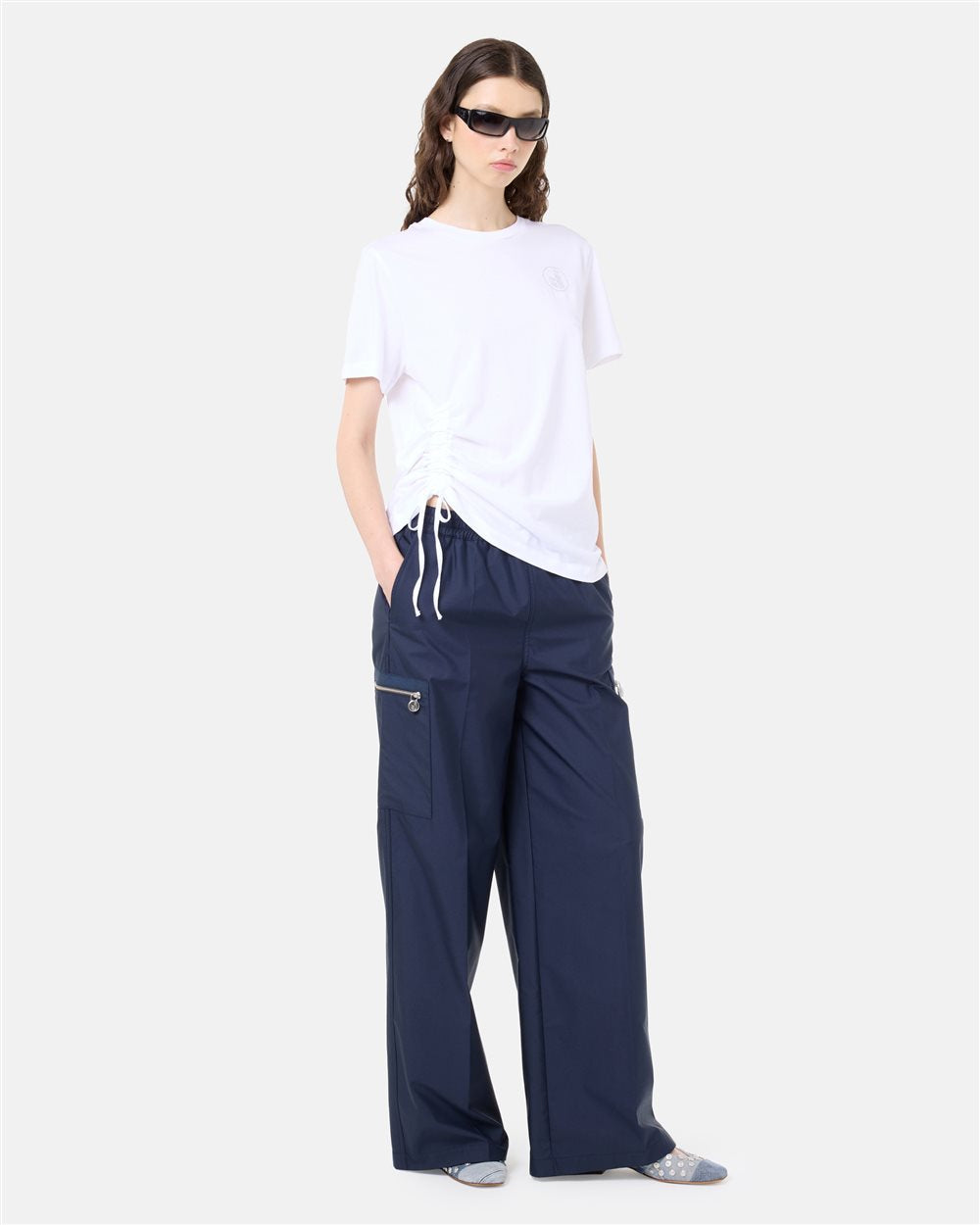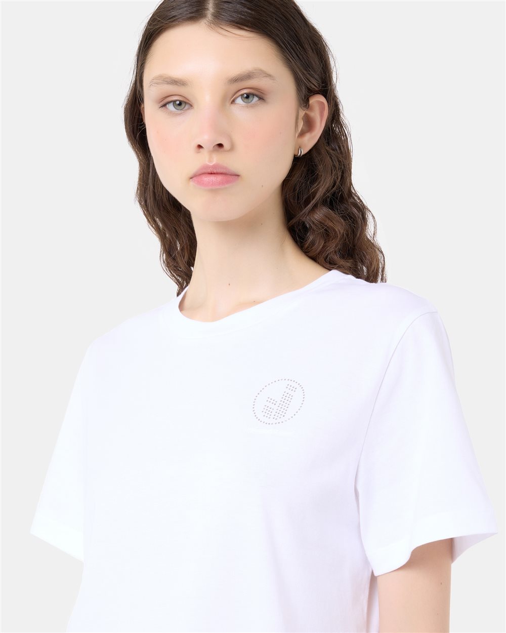 Camiseta branca ótica em malha de algodão com modelagem regular, desenhada para acompanhar naturalmente a silhueta. O detalhe de túnel com cordão no tecido principal, do lado esquerdo, introduz um elemento dinâmico e contemporâneo, enquanto a estampa da marca IJ com strass no centro em formato de coração adiciona um toque vibrante e distinto. Uma peça essencial reinterpretada com personalidade, ideal para elevar o seu guarda-roupa do dia a dia.