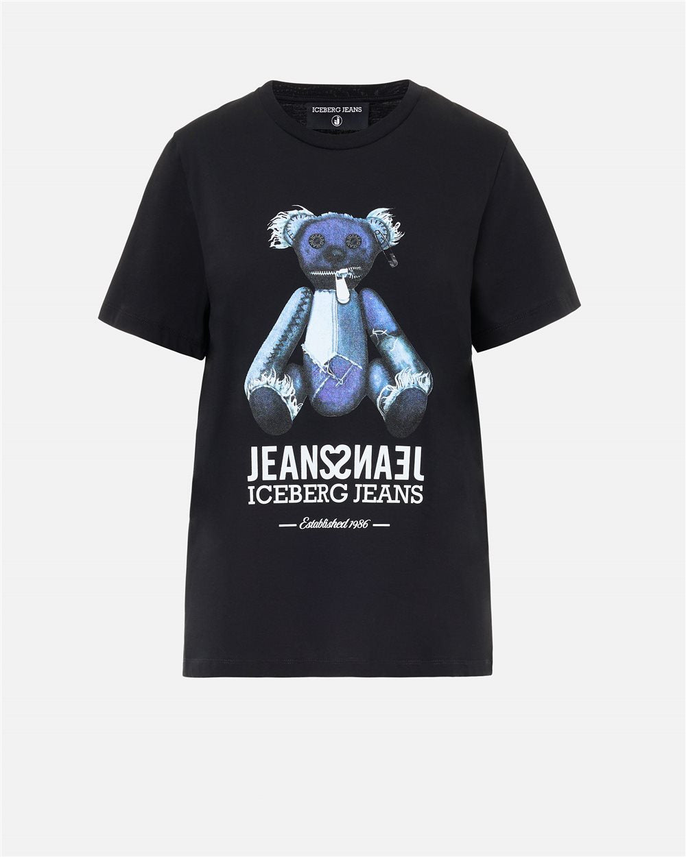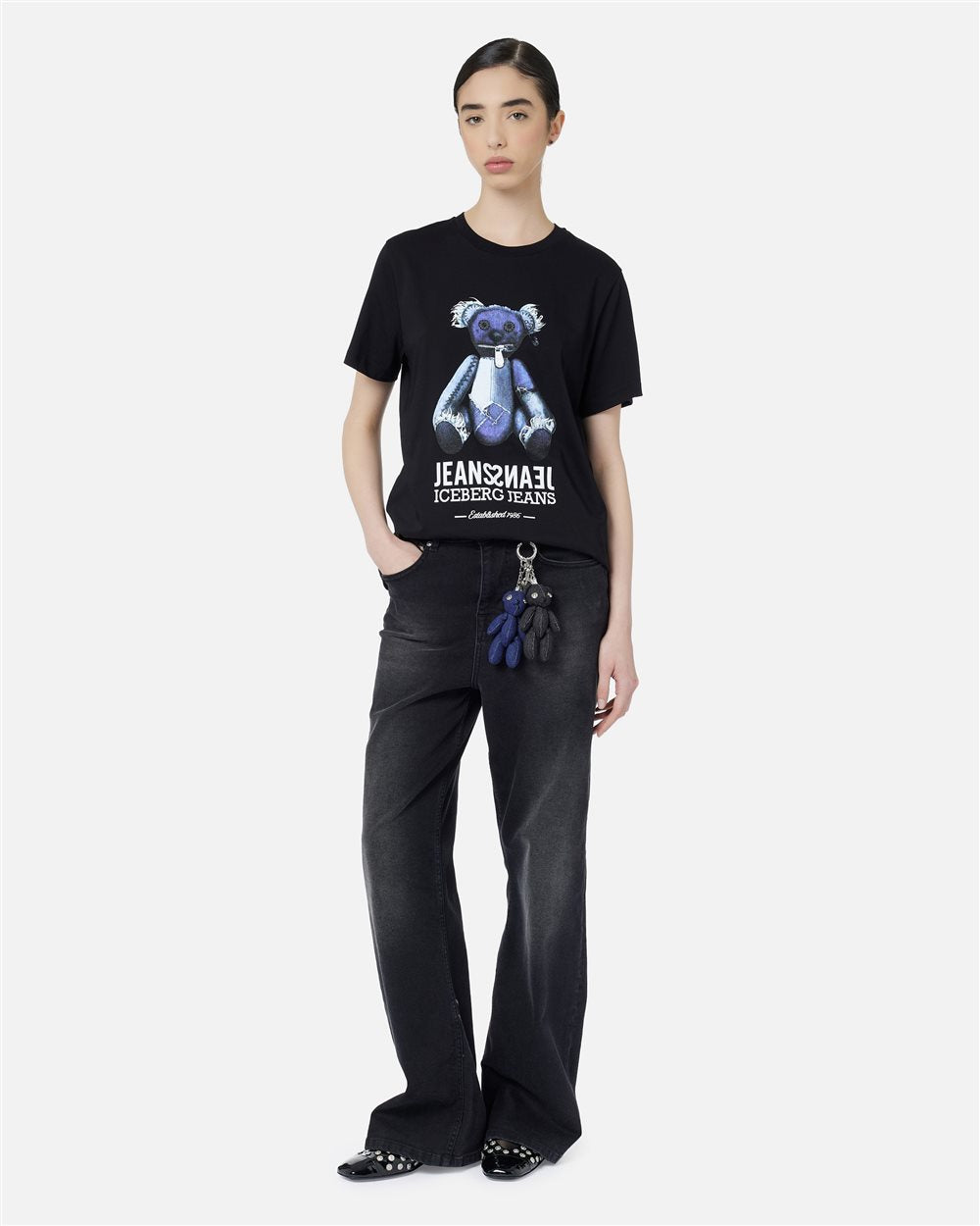 T-shirt preta de algodão jersey com corte regular combina essencialidade com uma estampa divertida. A gola canelada proporciona um acabamento clean, enquanto a estampa de ursinho de pelúcia com efeito jeans e o logotipo brilhante no centro frontal expressam a estética pop distinta da Iceberg, com um toque de brilho que chama a atenção.