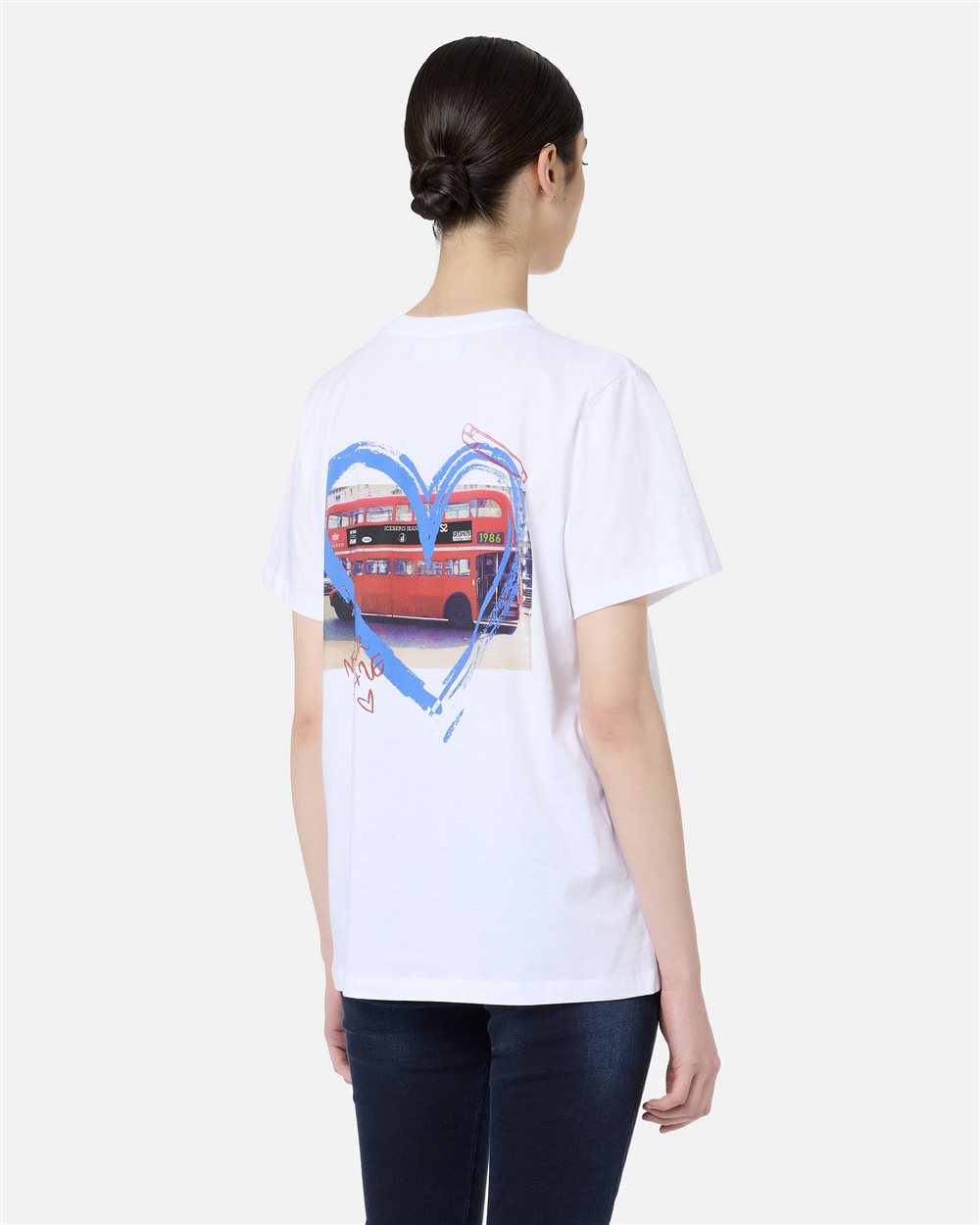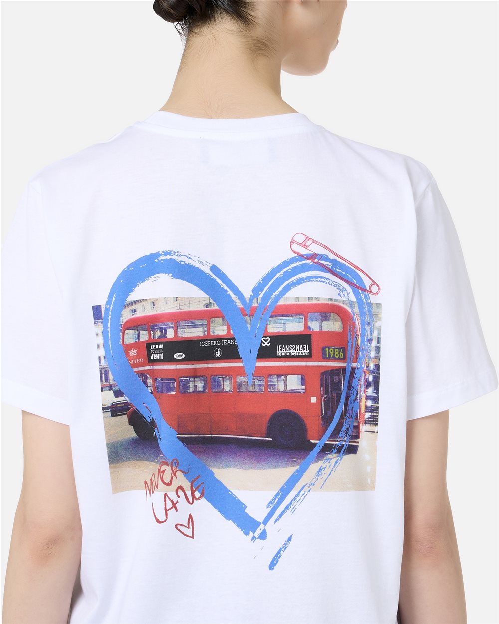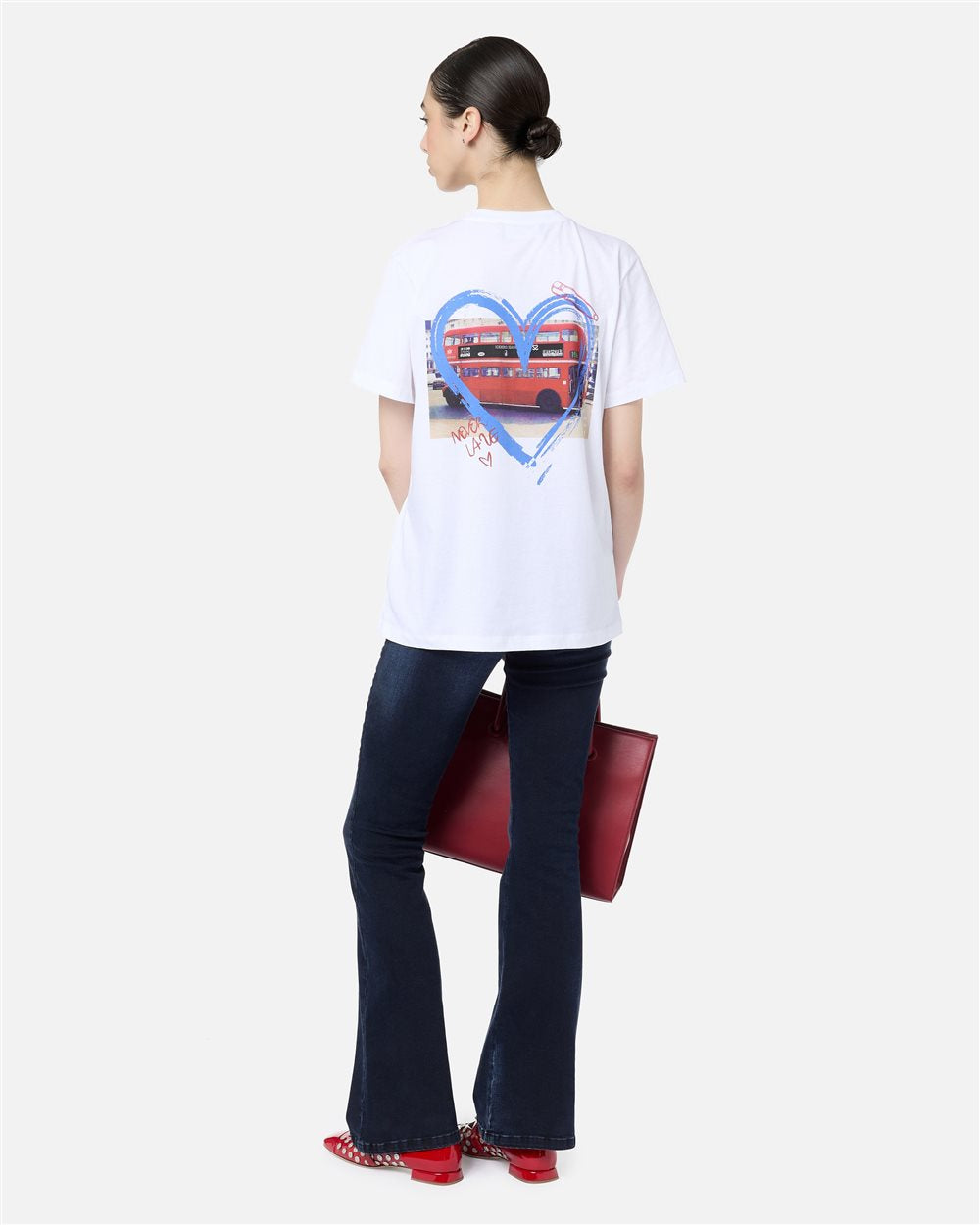 Camiseta de corte regular confecionada em jersey macio de algodão branco óptico, com gola canelada para um ajuste confortável. A peça apresenta um discreto logotipo bordado no centro da frente, enquanto a estampa Double Decker da coleção se destaca nas costas, conferindo-lhe um caráter distinto e contemporâneo. Perfeita para quem busca um equilíbrio entre minimalismo e detalhes icônicos.
