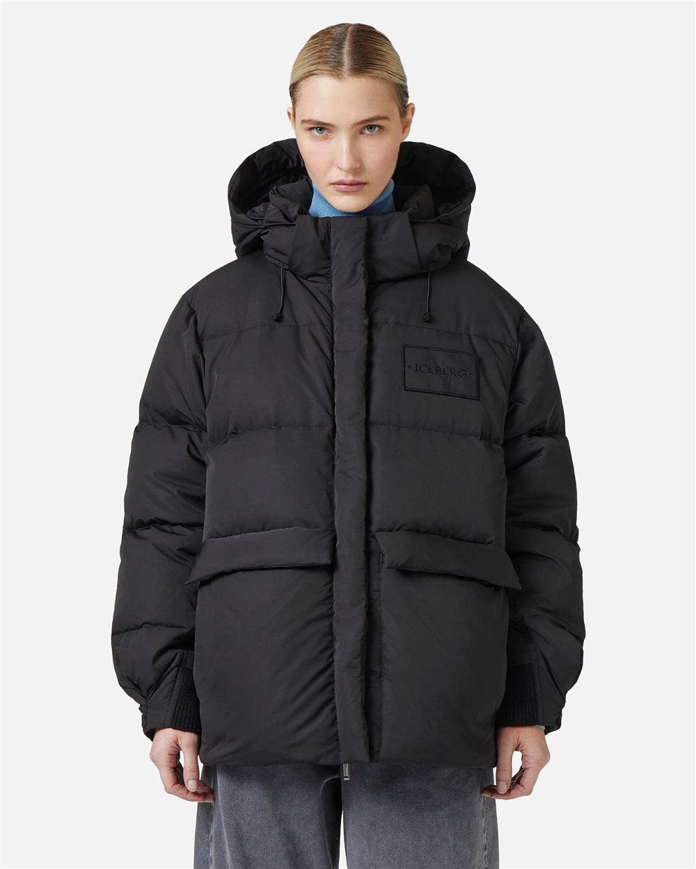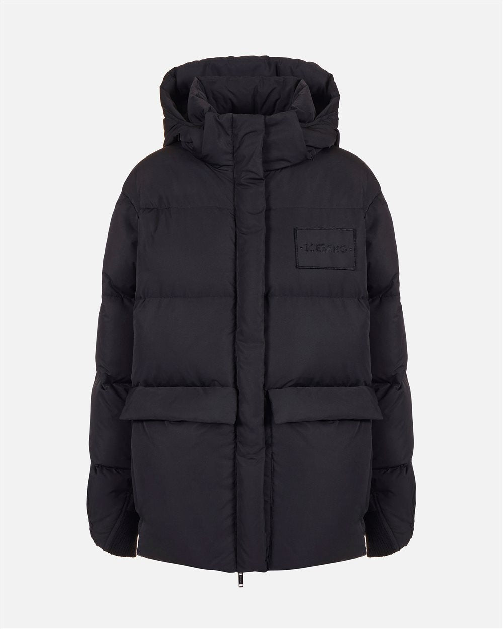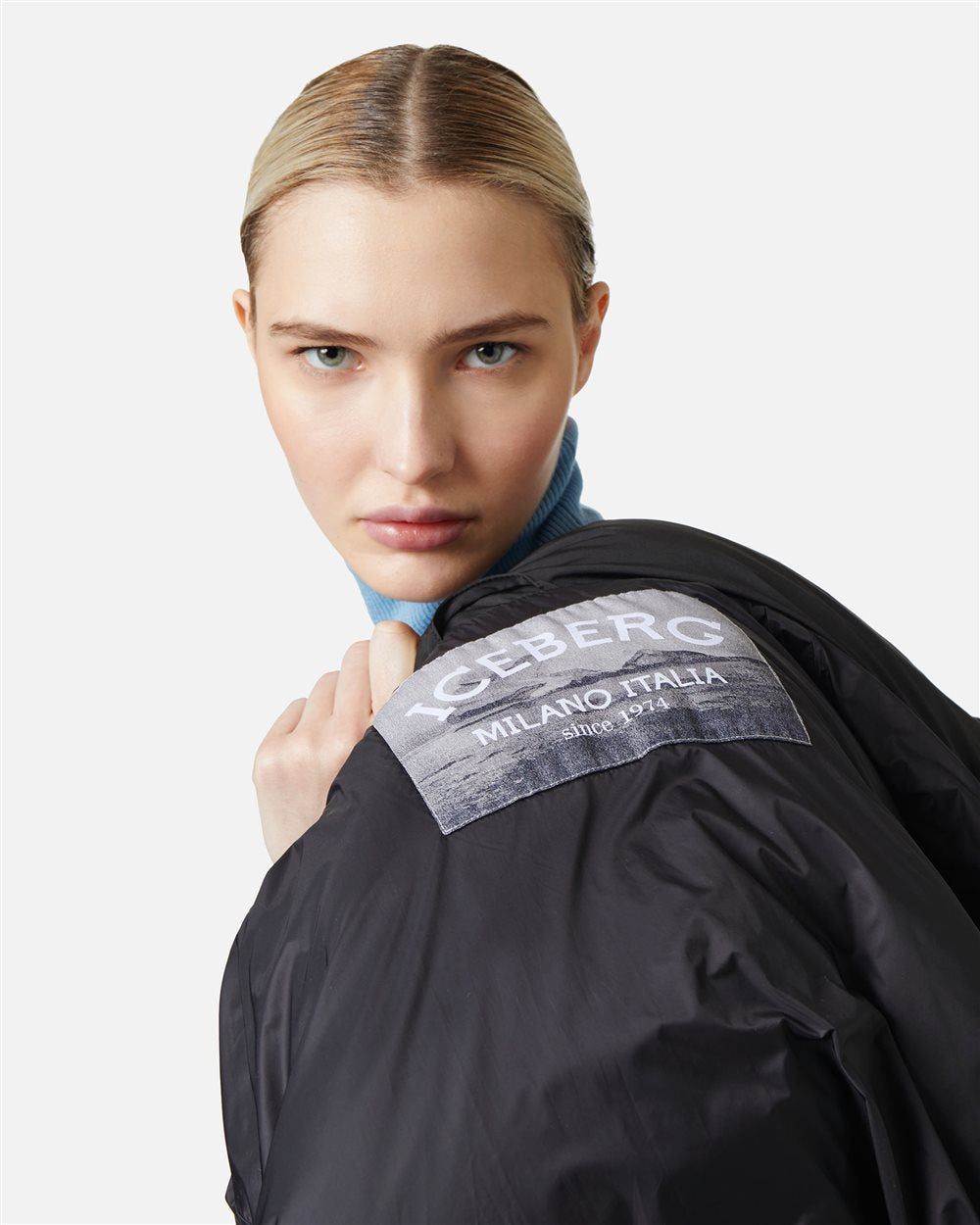 Confeccionada em nylon preto leve, esta jaqueta preta acolchoada com penas oferece aquecimento e conforto sem abrir mão do estilo. O detalhe marcante é o patch com o logotipo Iceberg bordado no peito esquerdo, para um toque icônico e reconhecível.