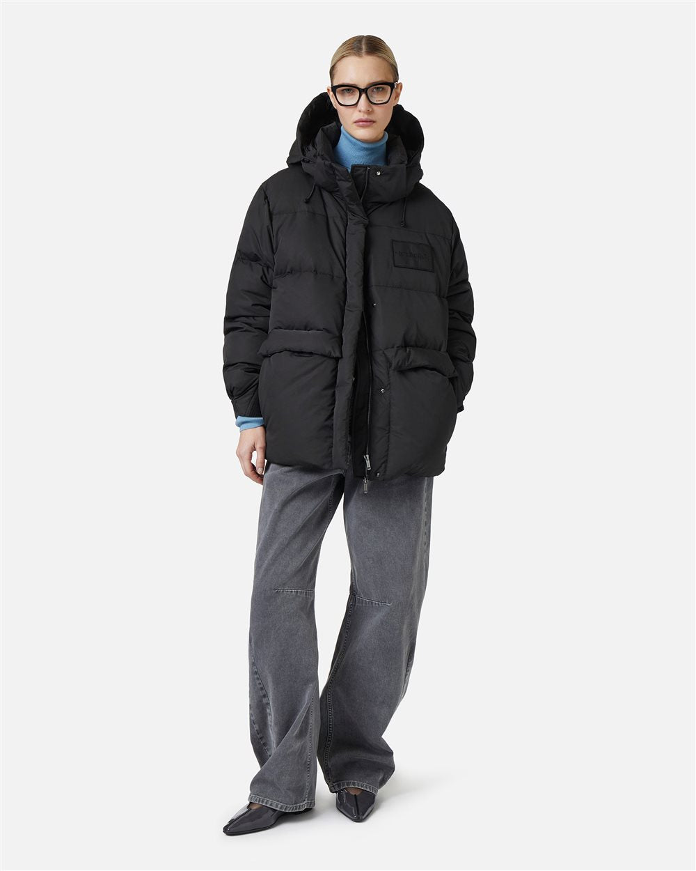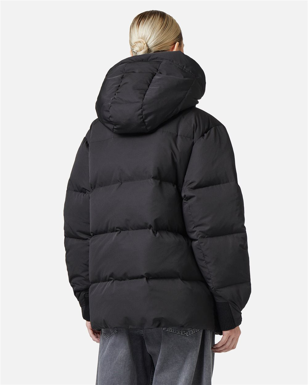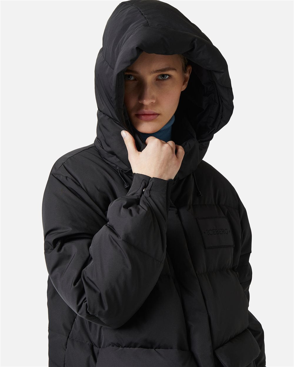 Confeccionada em nylon preto leve, esta jaqueta preta acolchoada com penas oferece aquecimento e conforto sem abrir mão do estilo. O detalhe marcante é o patch com o logotipo Iceberg bordado no peito esquerdo, para um toque icônico e reconhecível.