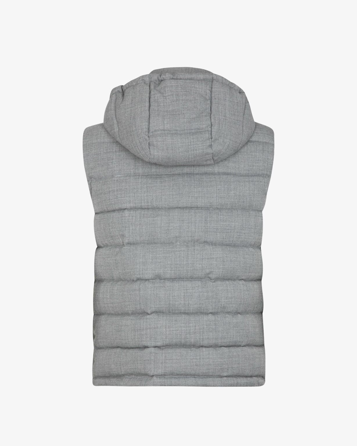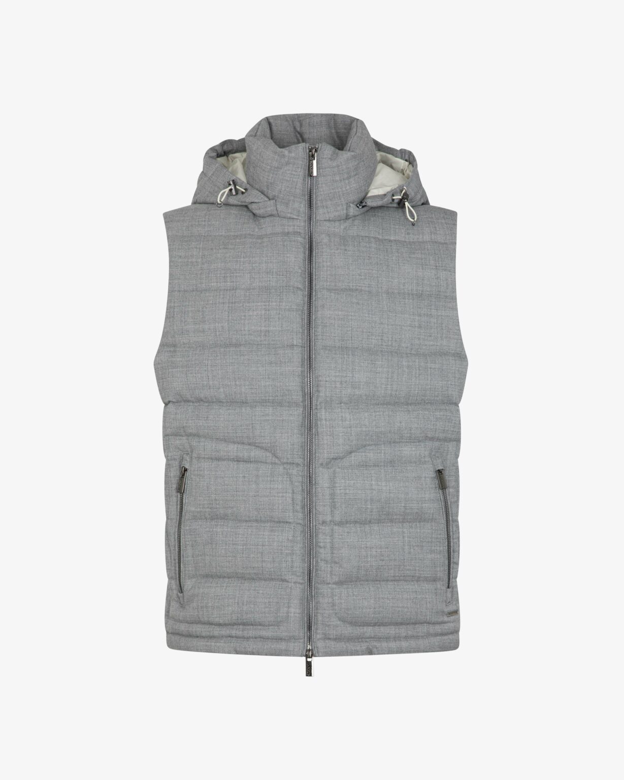 Colete com capuz ajustável e removível. Fecho frontal com zíper e bolsos laterais.