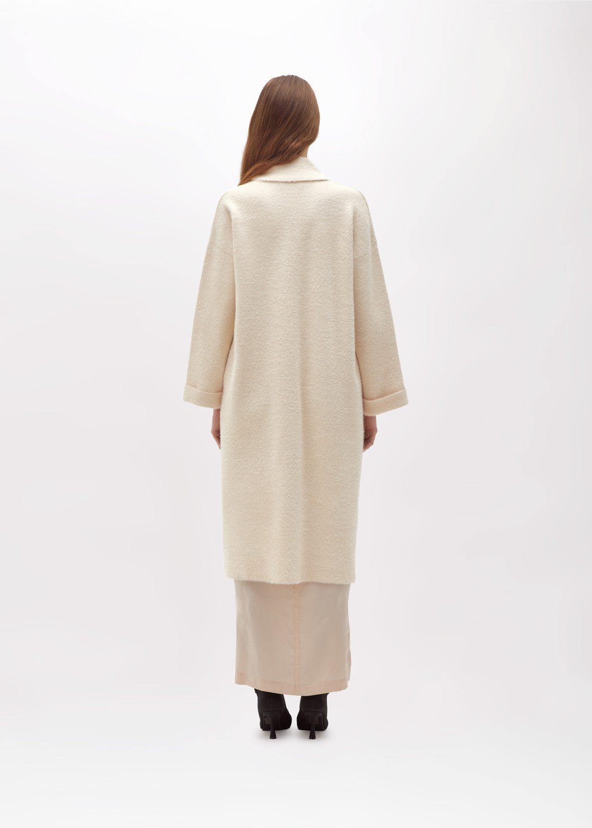 Sofisticado, dramático, confortável. Cardigan Oversize com efeito de pele e gola cachecol. Decote em V, fechamento com botões de joia, mangas longas e largas com punho.