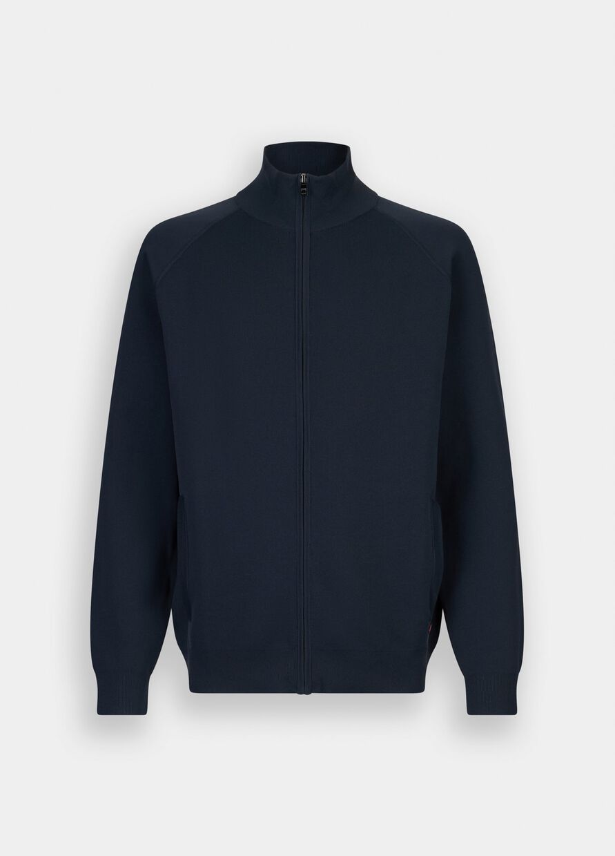 Cardigan cinza de malha elástica com mistura de algodão, gola alta, mangas longas, bolsos nas laterais. Logotipo na bainha, bordas caneladas e fecho de zíper.