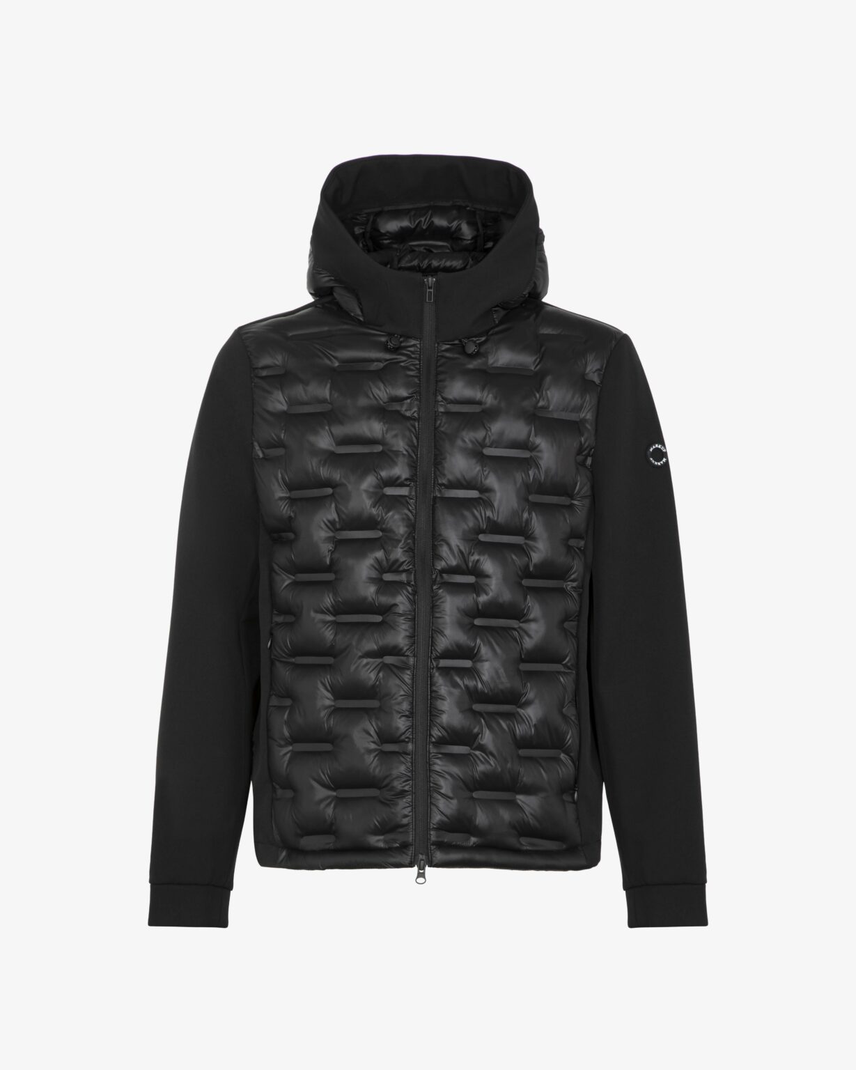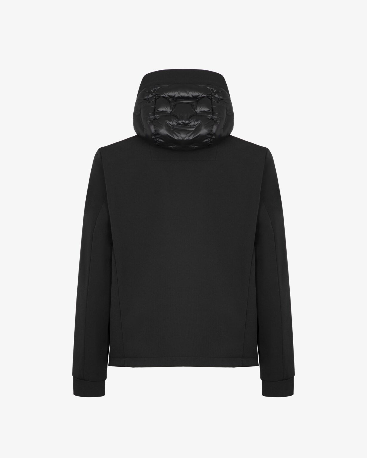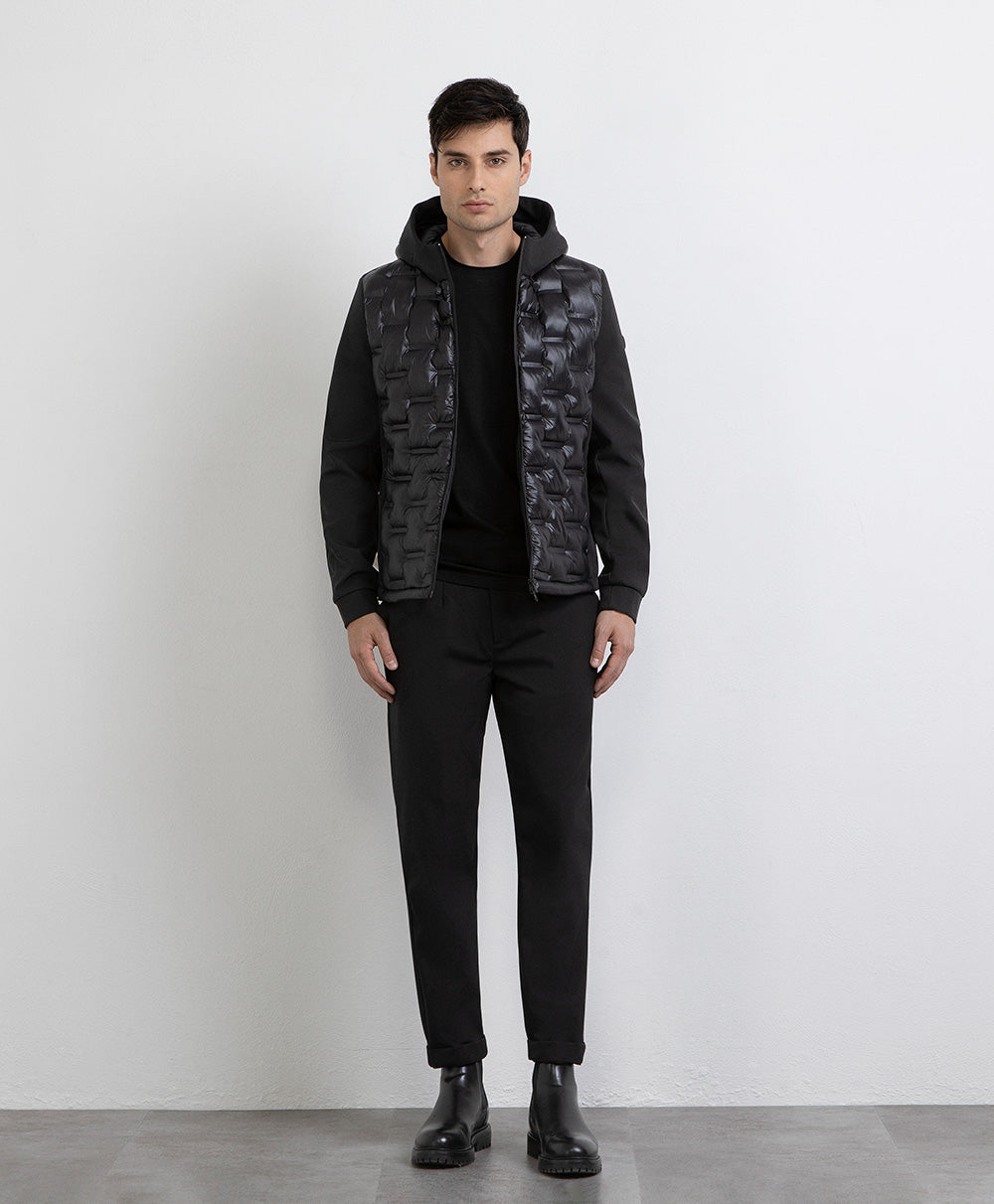 Casaco com capuz. Combinação de softshell e nylon. Acolchoamento de peso médio. Interior com detalhes estampados.