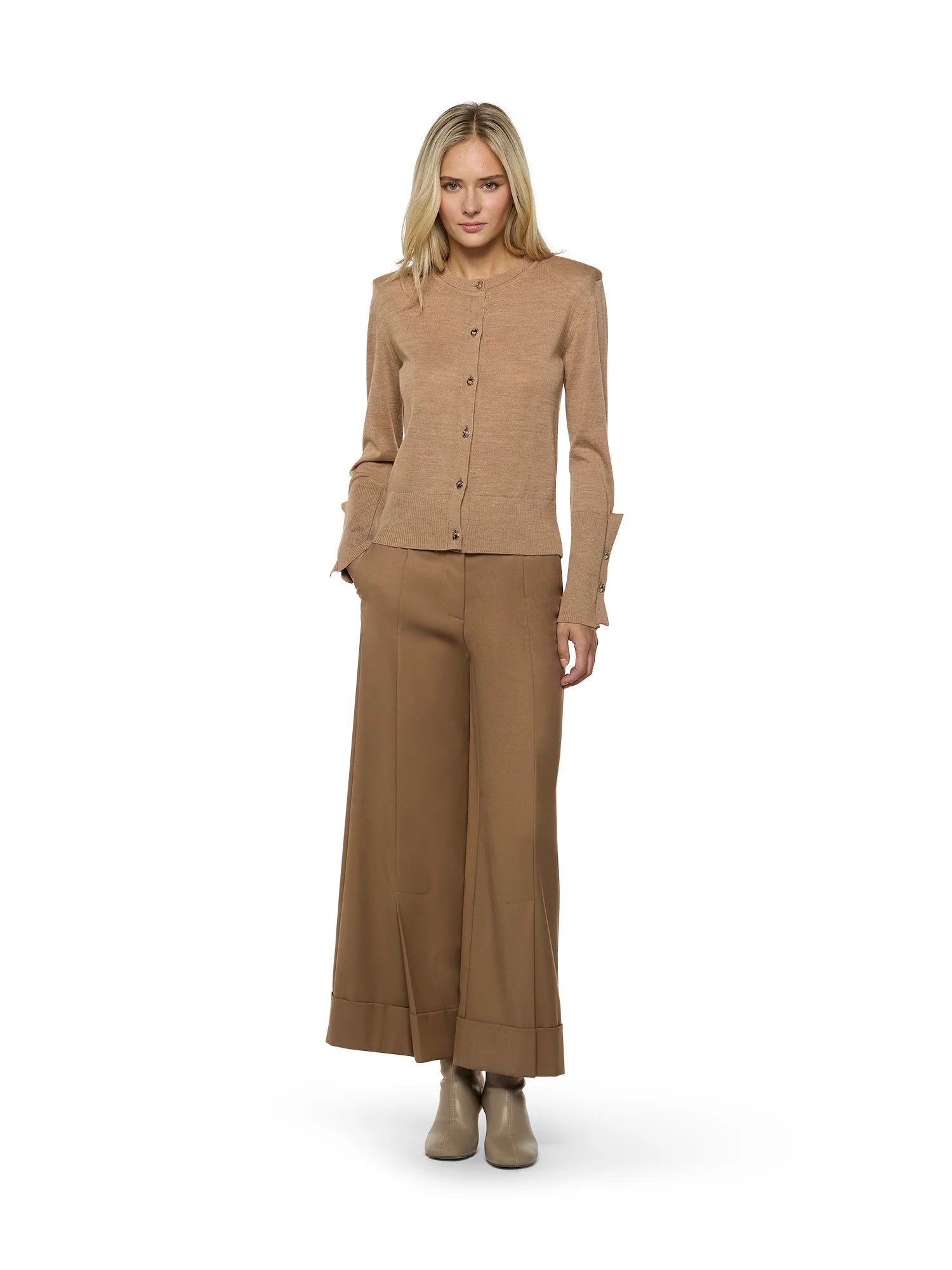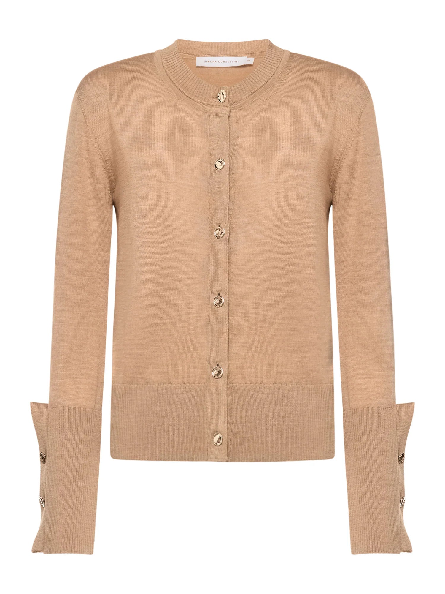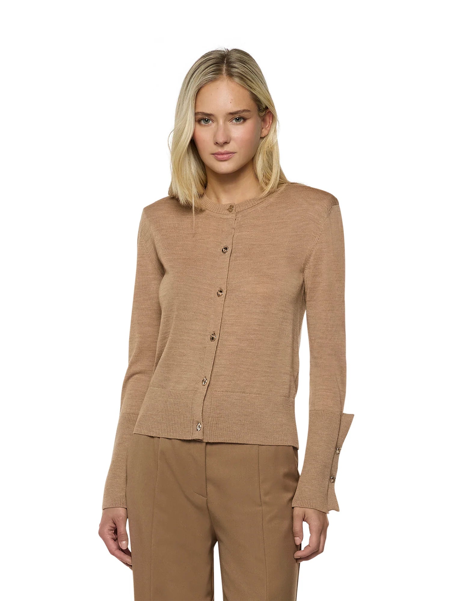 Cardigã de manga comprida em lã merino extrafina com alças internas. Possui fechamento frontal com botões dourados, gola redonda canelada, punhos e barra canelados. Os punhos apresentam recortes em formato de gota na parte frontal e dois botões dourados.