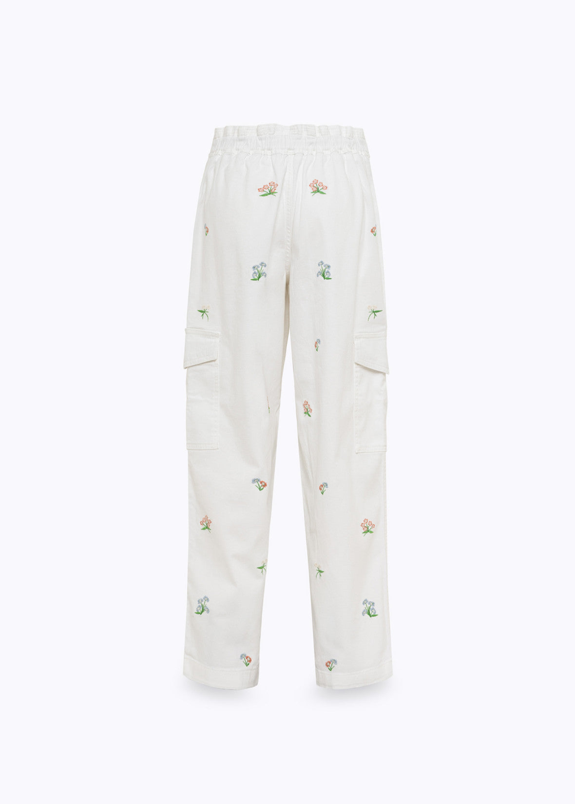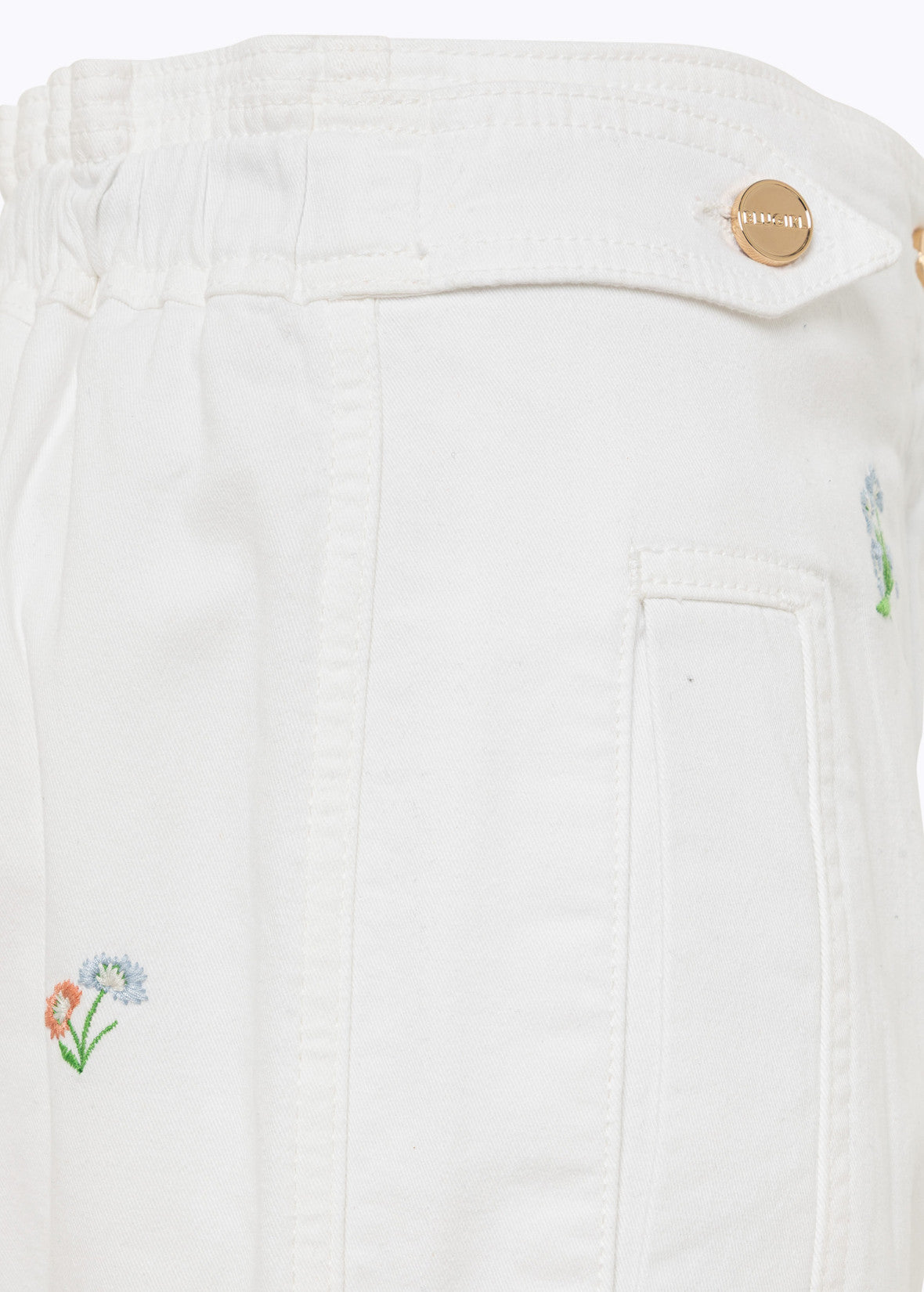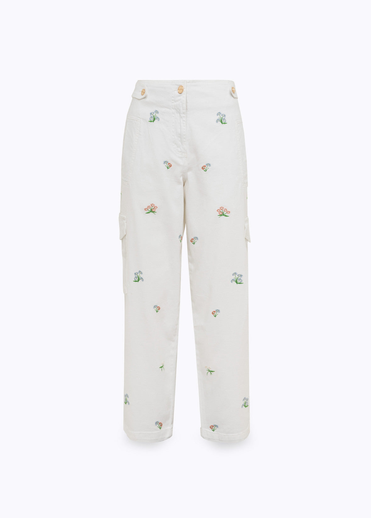 Uma peça distintamente urbana reinterpretada pela perspectiva da Blugirl. Estas calças cargo em gabardine de algodão apresentam bordados florais multicoloridos. Com cintura ajustável, fecho de zíper e botão, bolsos laterais e bolsos com aba aplicados nas laterais, possuem um corte suave e descontraído. A base perfeita para looks sofisticados do dia a dia.