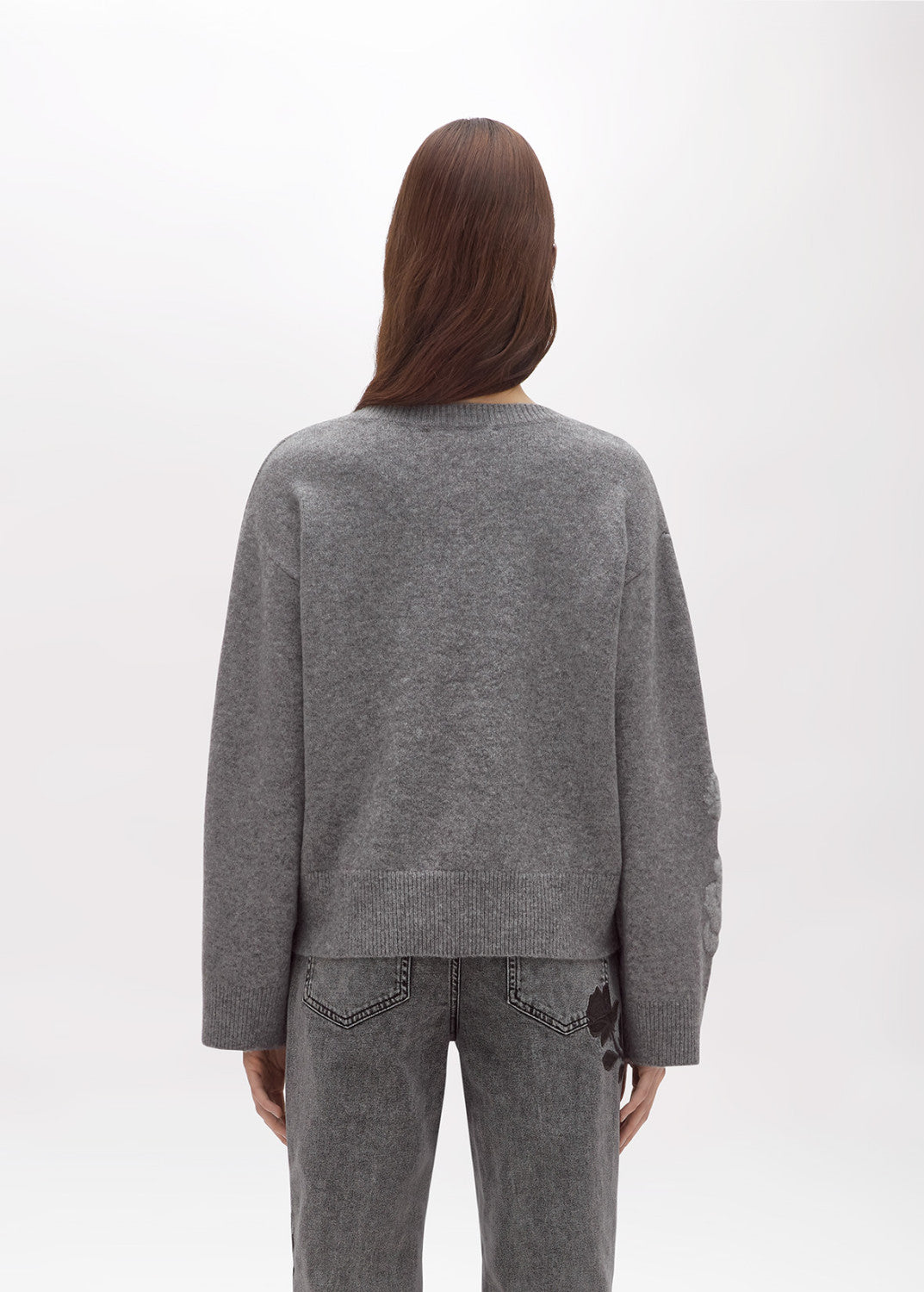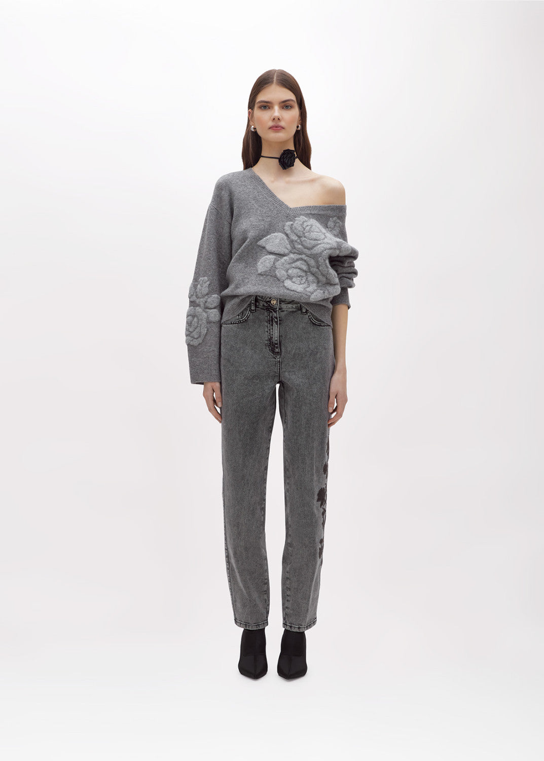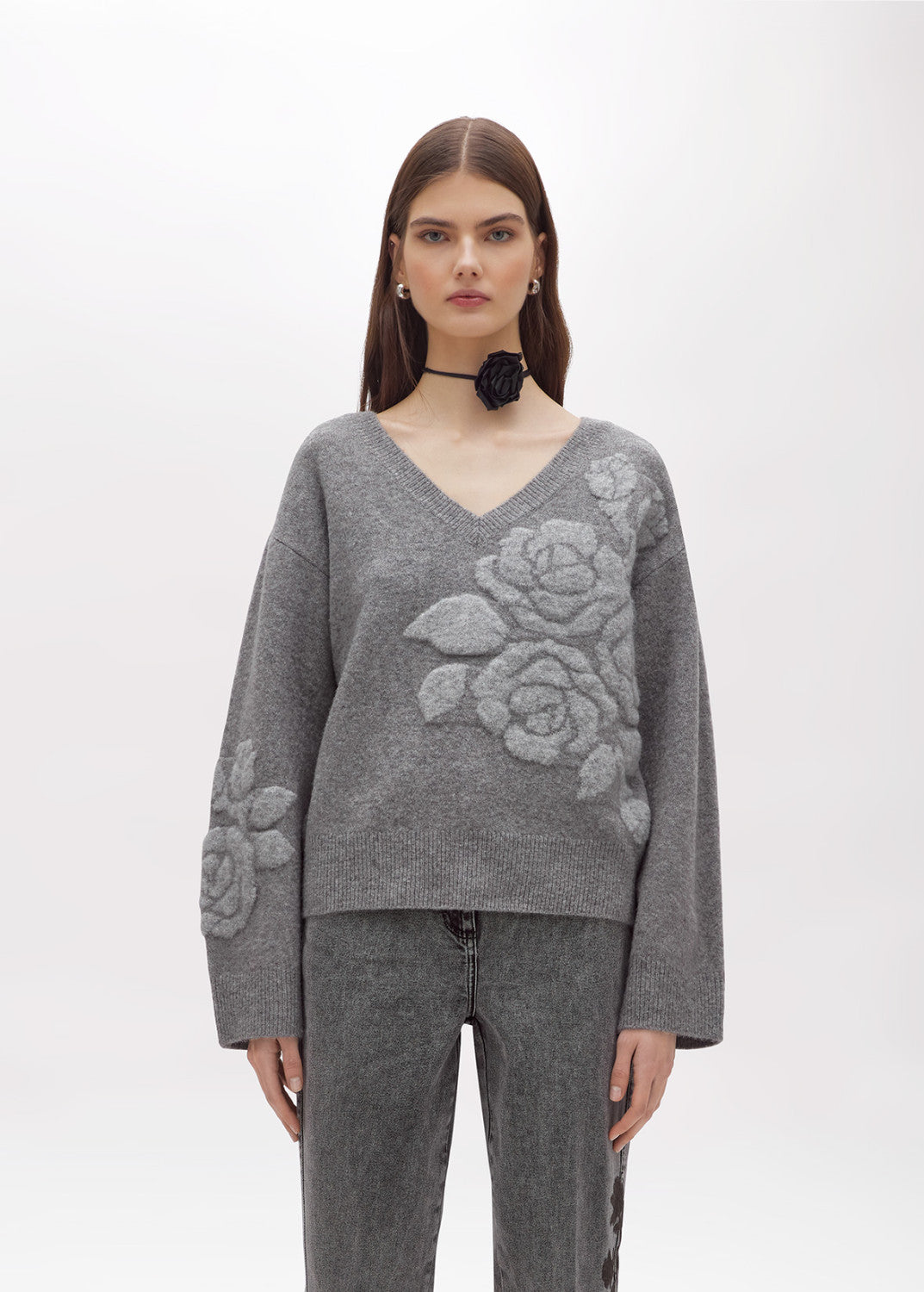 Malha jacquard com padrão tridimensional de rosas. Caimento boxy, decote em V, mangas compridas com ombros curado, feito com um fio de mistura de lã macio, quente e agradável, perfeito para um guarda-roupa versátil.