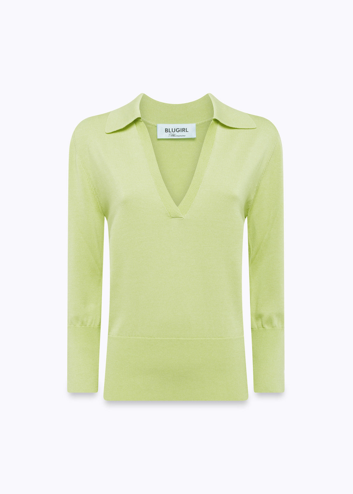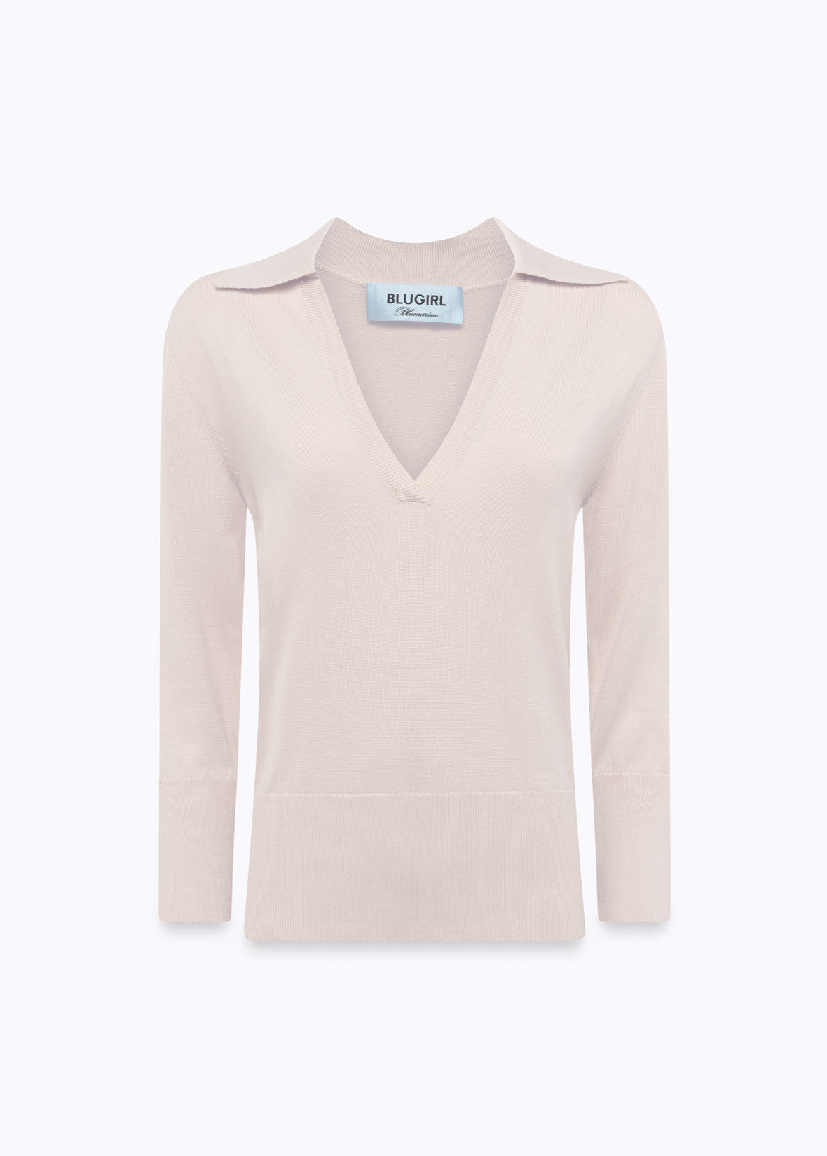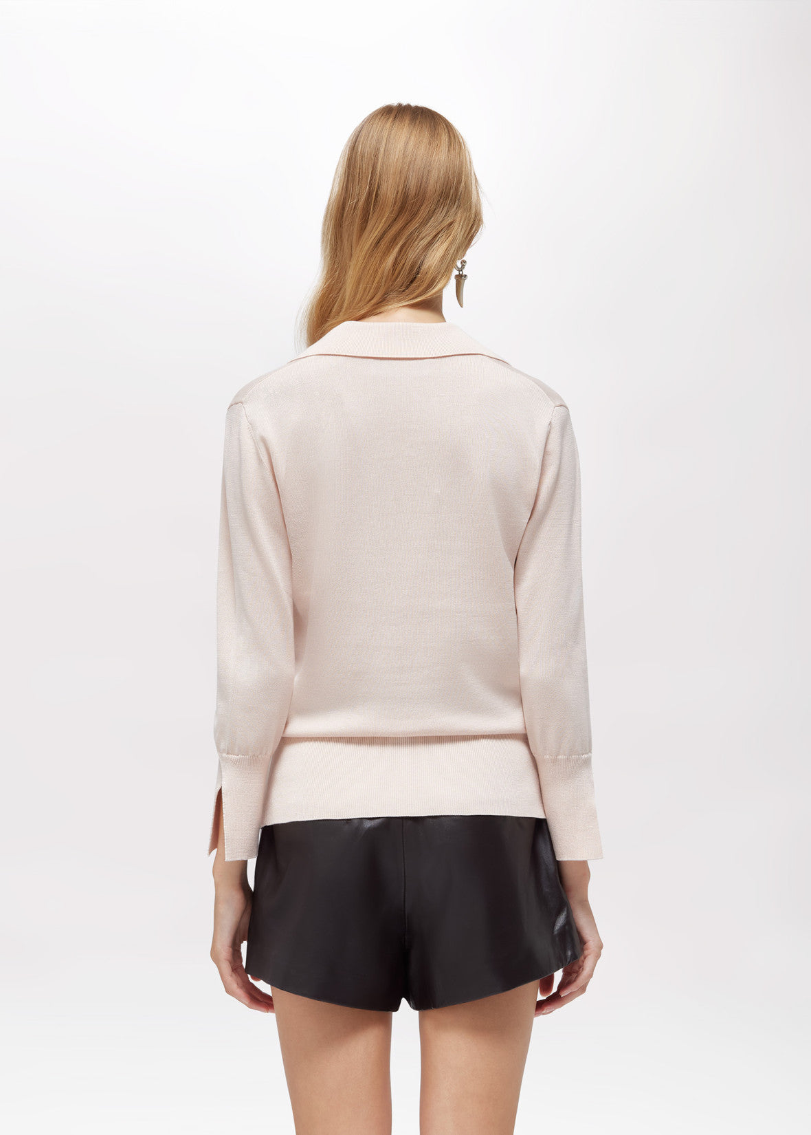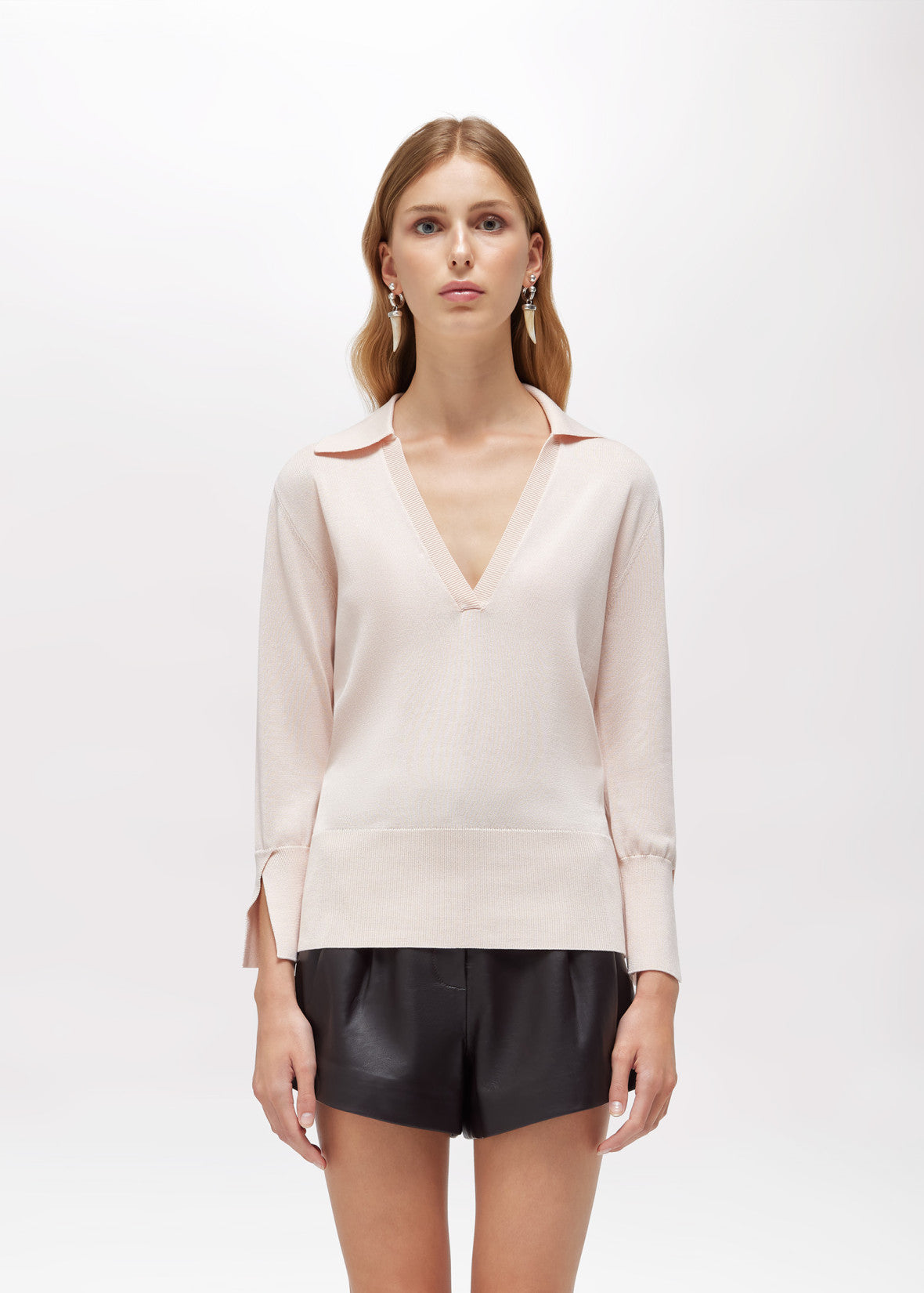 Uma versão fluida e essencial da polo de malha, realçada pelo icônico broche de rosa. Confeccionada em uma mistura de lyocell e algodão, possui gola com abertura em V, mangas curtas e modelagem slim. Perfeita para compor looks formais e casuais. Composição: 58% Lyocell, 27% Algodão, 15% Acetato.