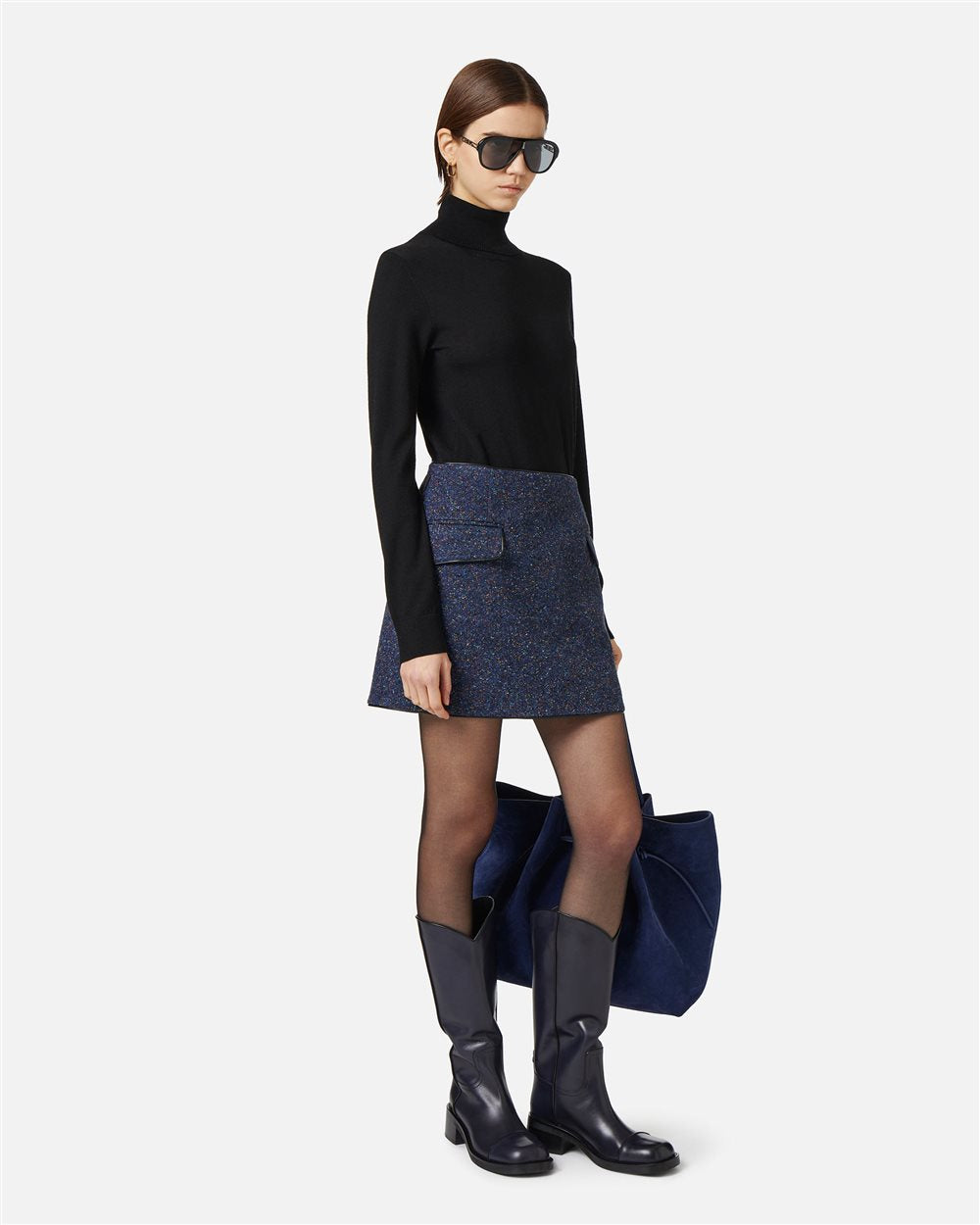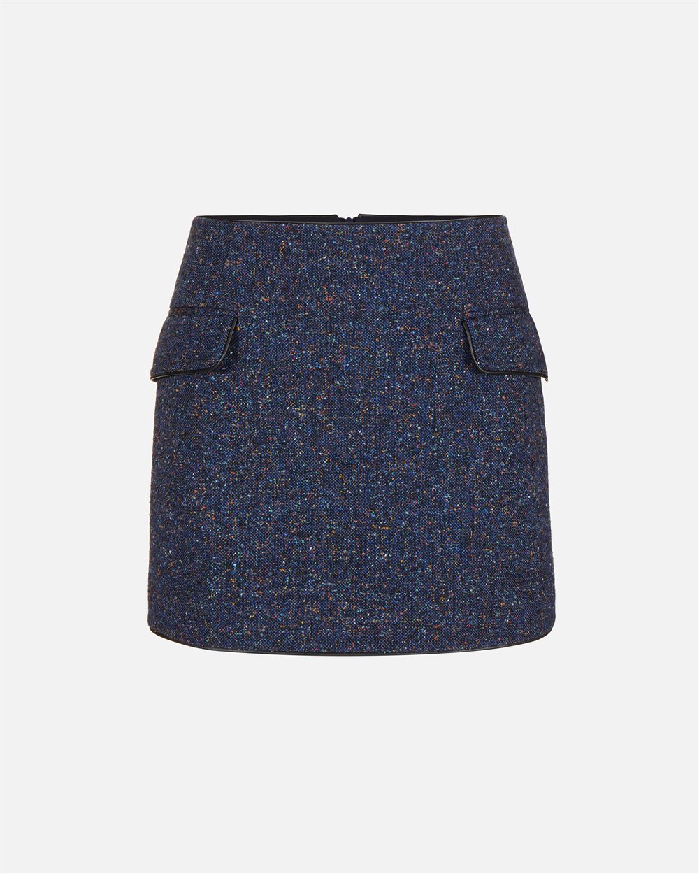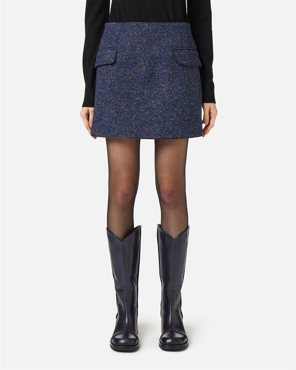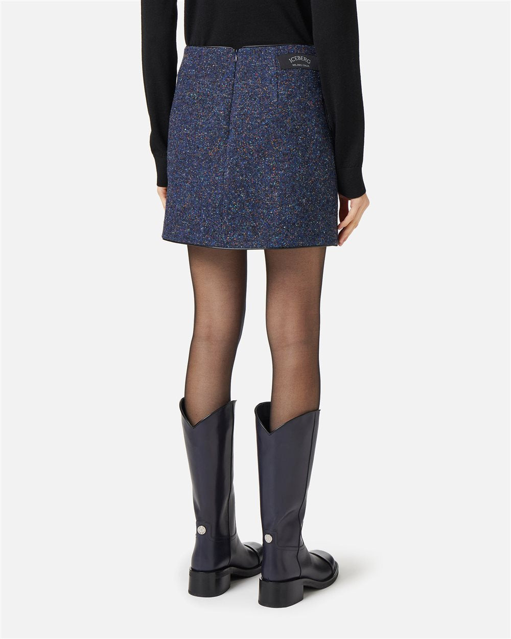 Saia curta com cintura regular em bouclé pesado, com acabamento texturizado em tons de azul. O perímetro, a cintura, a barra e as abas dos bolsos são finalizados com vivo contrastante em couro sintético preto. Fechamento por zíper invisível nas costas e etiqueta personalizada aplicada.