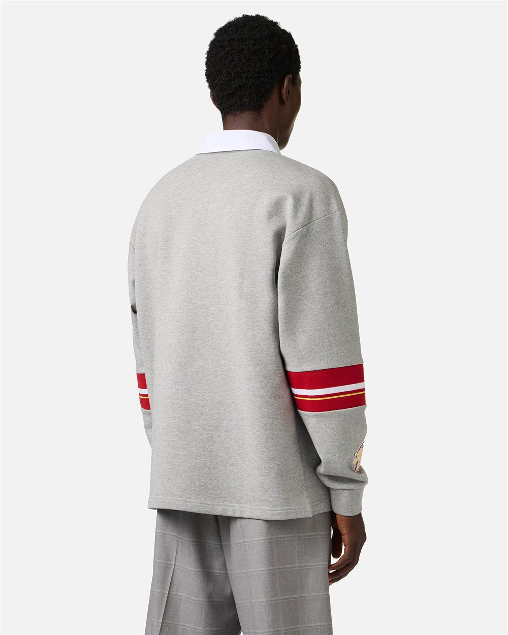 Sweatshirt cinza claro com modelagem rugby em algodão. A gola em gabardine confere um toque de alfaiataria, enquanto o acabamento canelado listrado nas mangas, coordenado com os punhos, cria um efeito gráfico contemporâneo. Na parte frontal, uma mistura de estampas e bordados dos Looney Tunes adiciona personalidade e estilo. Uma peça diferenciada, criada para expressar um estilo casual com atitude original.
