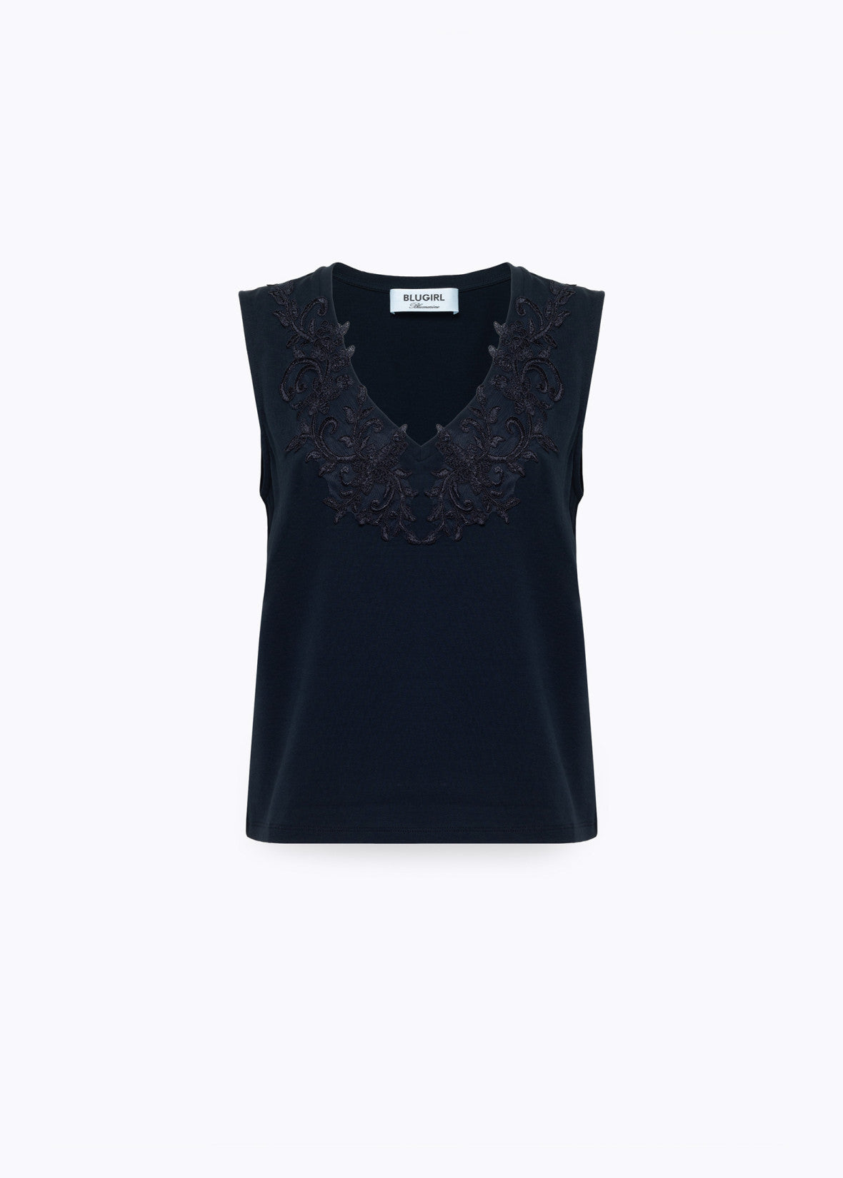 Adicione um toque romântico e confortável ao seu estilo com esta blusa de malha de algodão com elastano, com decote adornado com renda floral. Com decote em V e silhueta reta, é ideal para usar sobre calças fluidas, mas também se torna uma peça essencial quando usada sob blazers e cardigans.