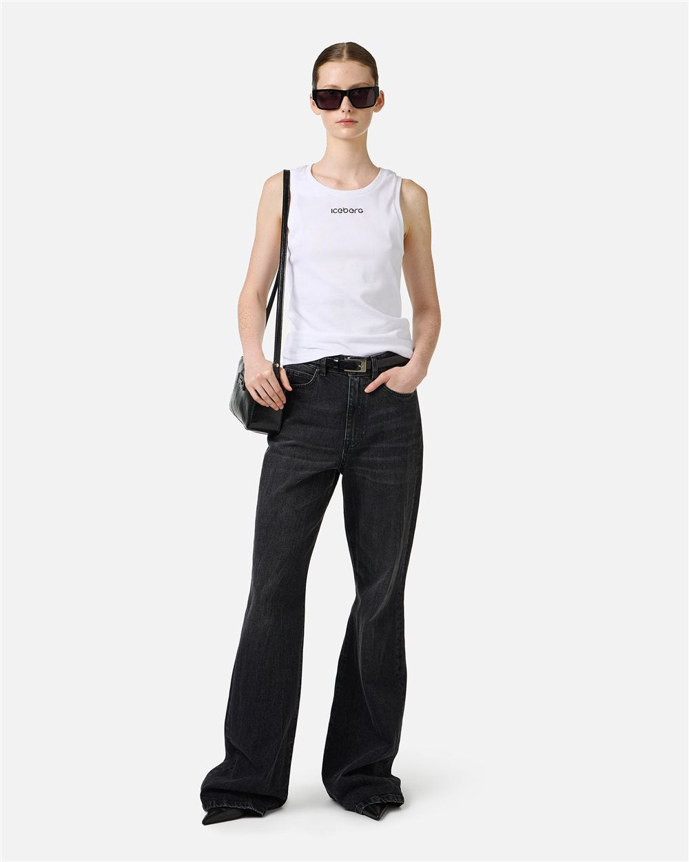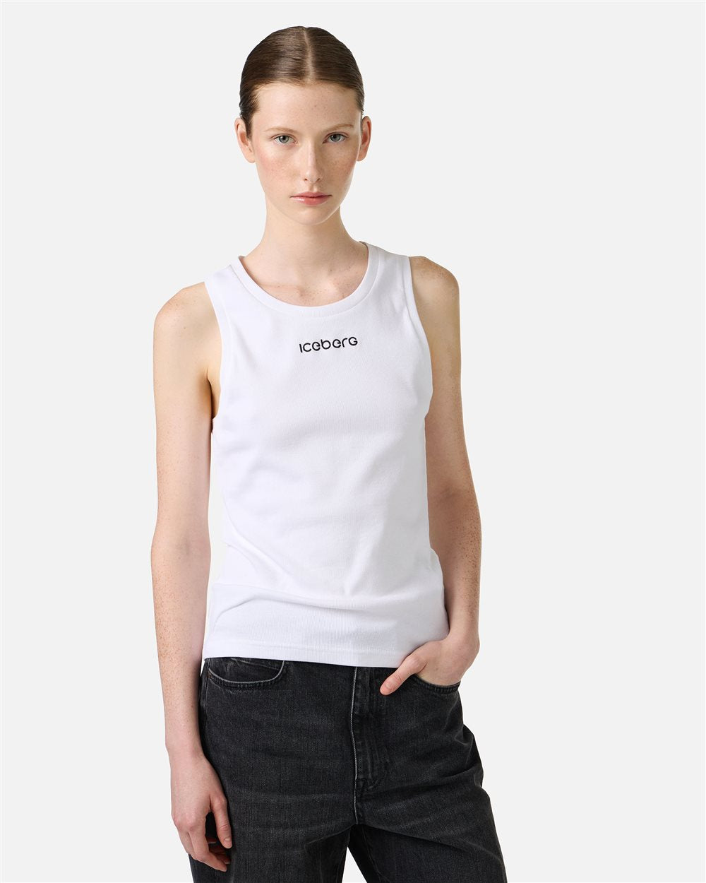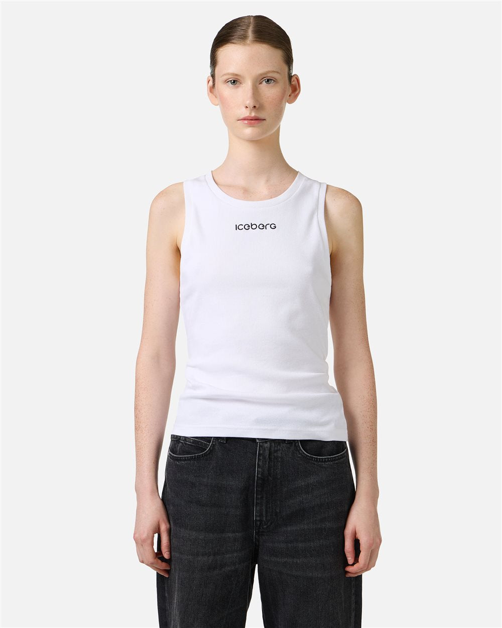 Regata branca ótica em malha de algodão stretch canelada, desenhada para acompanhar o corpo com naturalidade e conforto. A estrutura elástica acompanha as linhas do corpo com equilíbrio, enquanto a placa metálica com a marca Iceberg aplicada na parte frontal central introduz uma assinatura icônica e discreta. Um modelo essencial e contemporâneo, ideal para complementar looks do dia a dia com elegância minimalista.