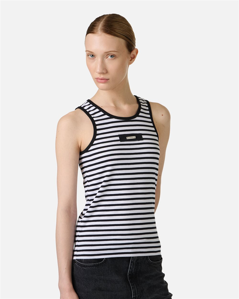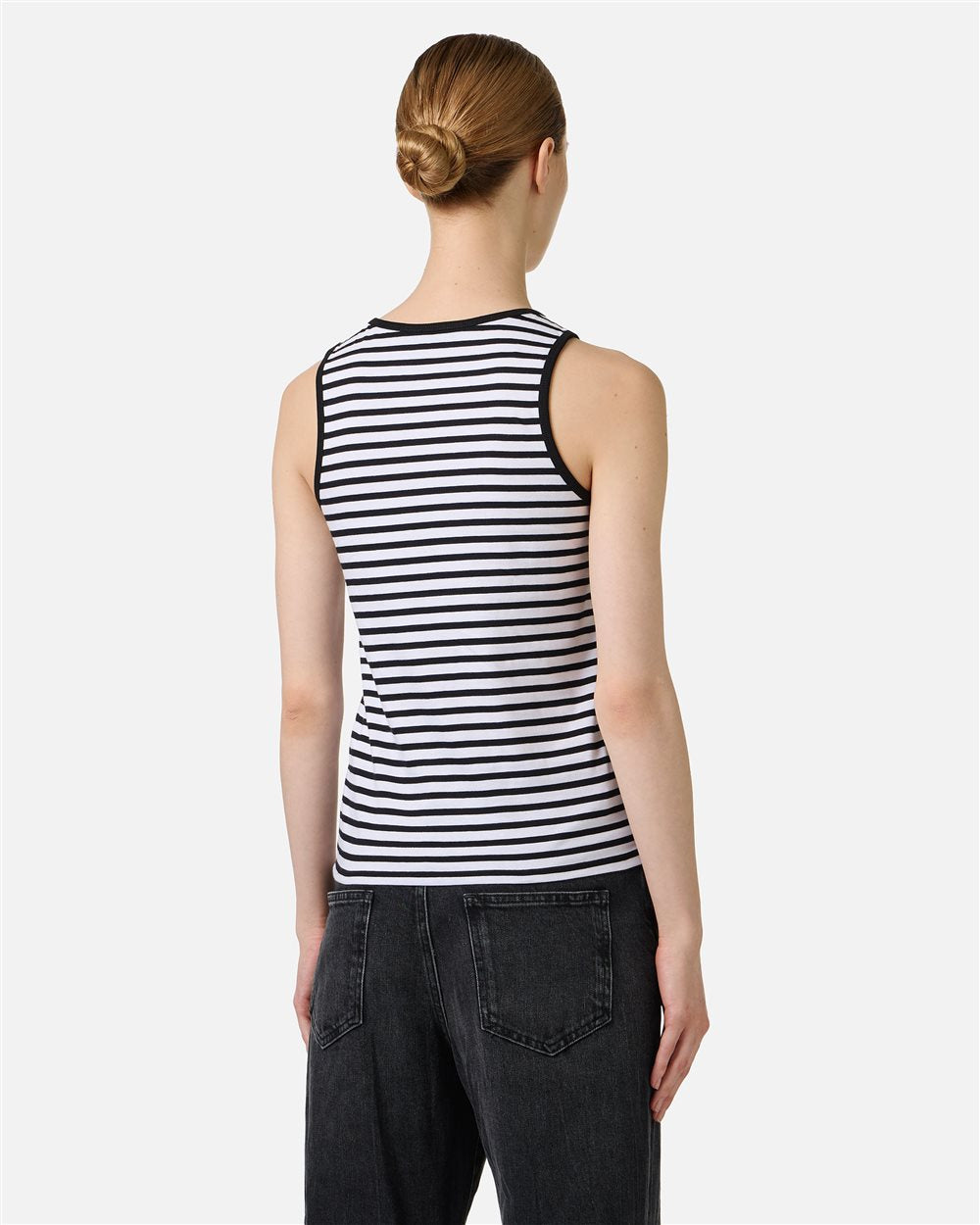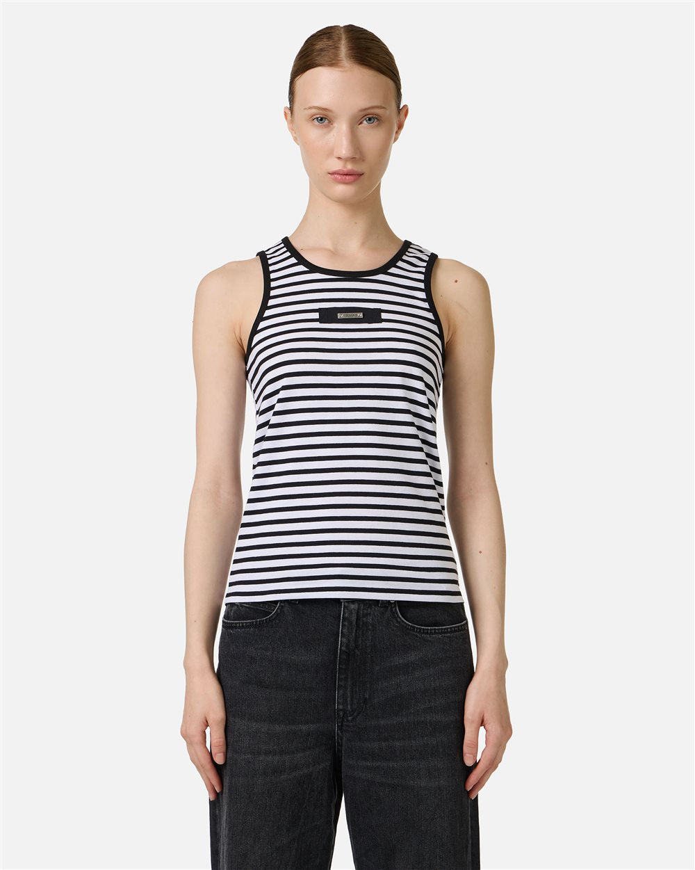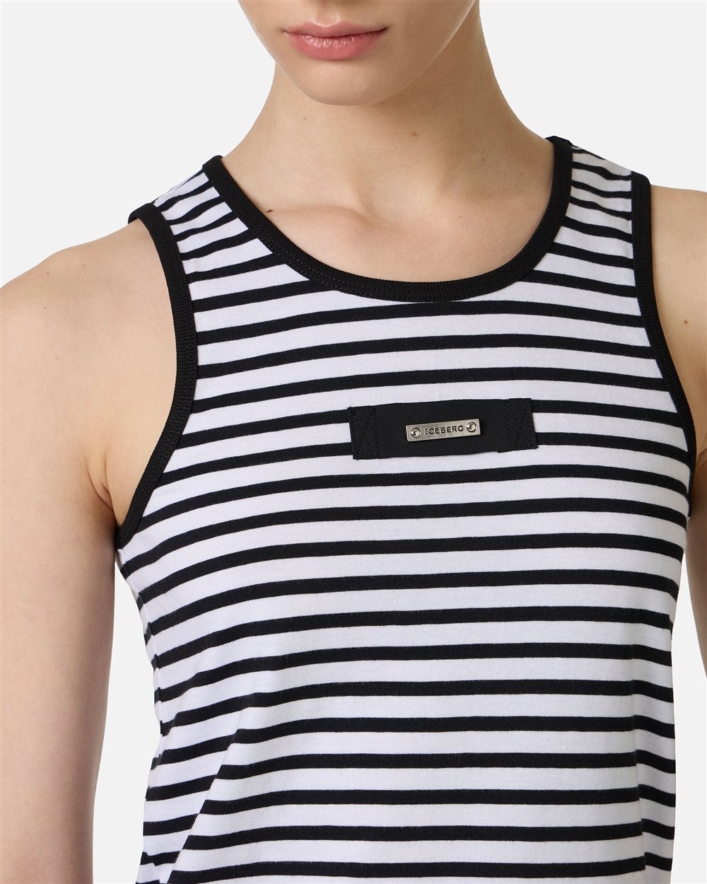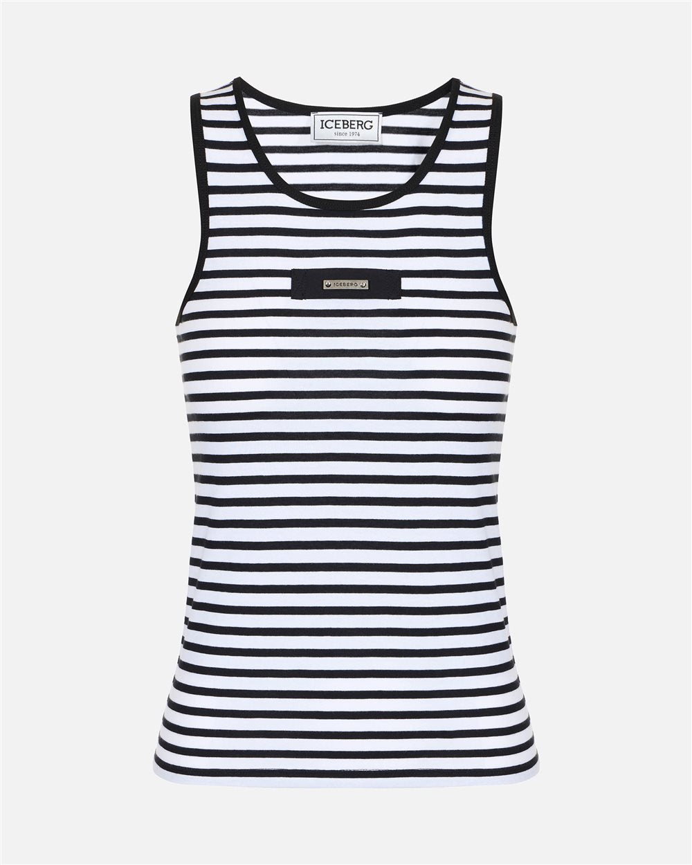 Regata listrada em preto e branco, confeccionada em malha de algodão, com modelagem slim que acompanha as curvas do corpo. Os detalhes canelados na gola redonda e nas cavas conferem um acabamento impecável, enquanto a placa com o logo na parte frontal adiciona um toque diferenciado. Uma peça essencial e contemporânea, criada para complementar qualquer look do dia a dia.