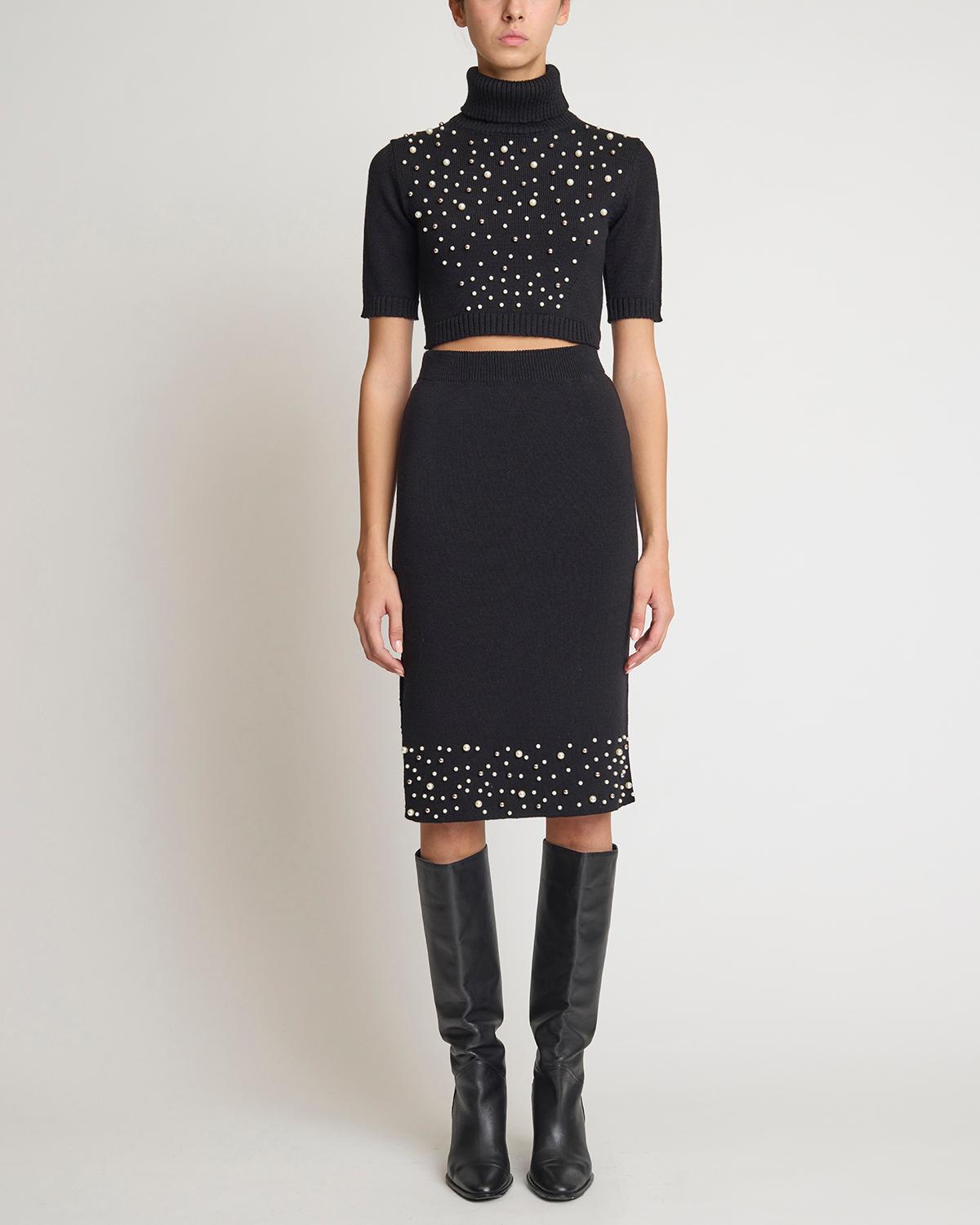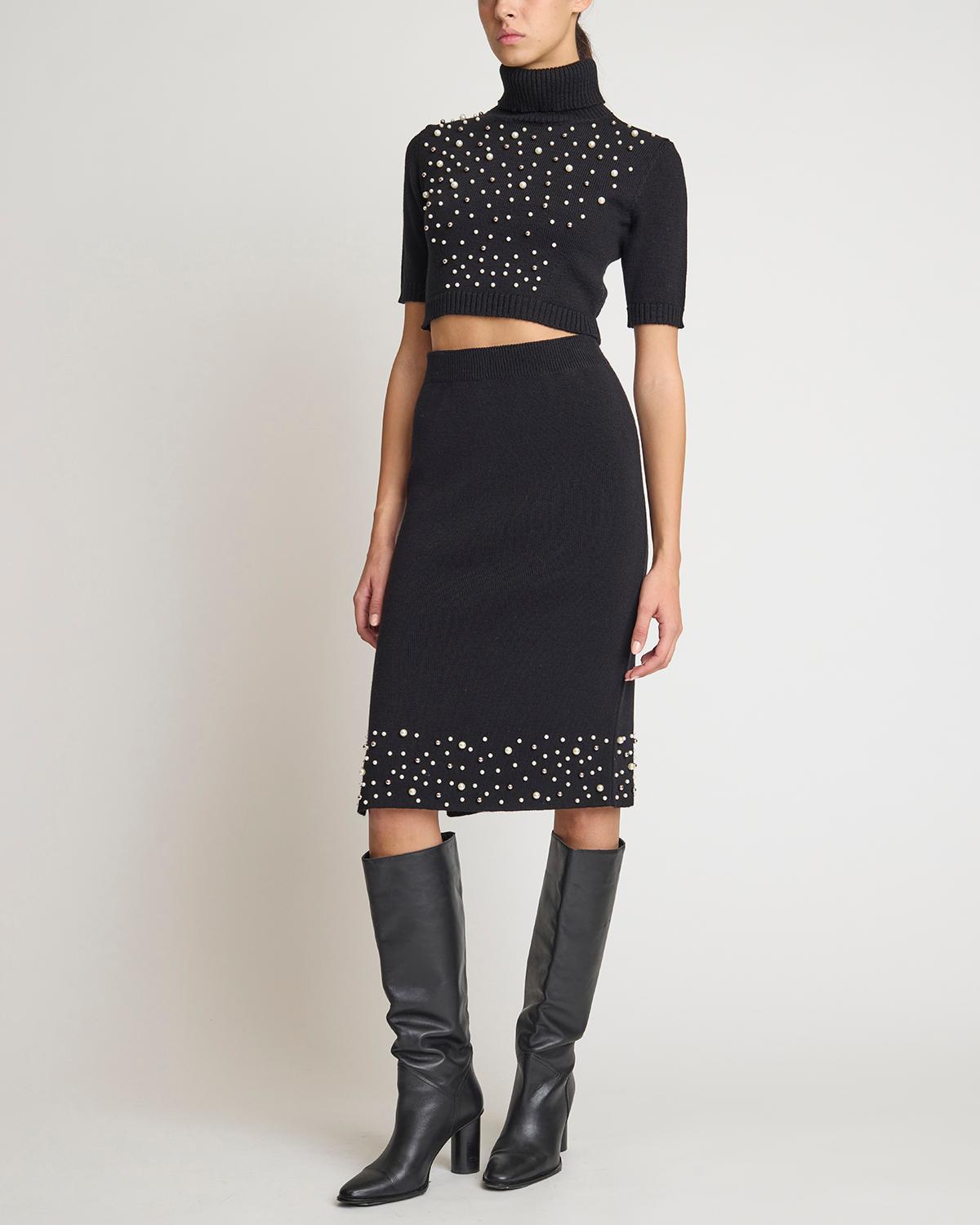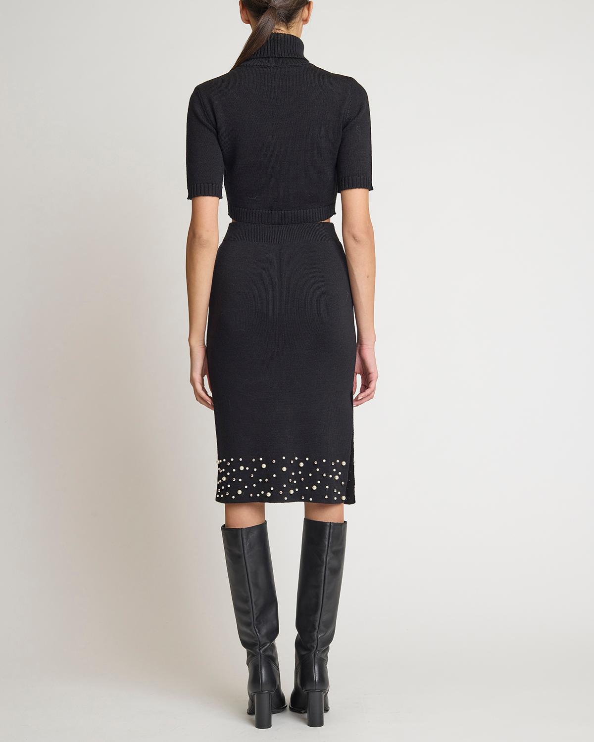 Saia de malha Simona Corsellini. Saia midi com racha na lateral e pormenor de contas de tamanhos diferentes na parte inferior.
