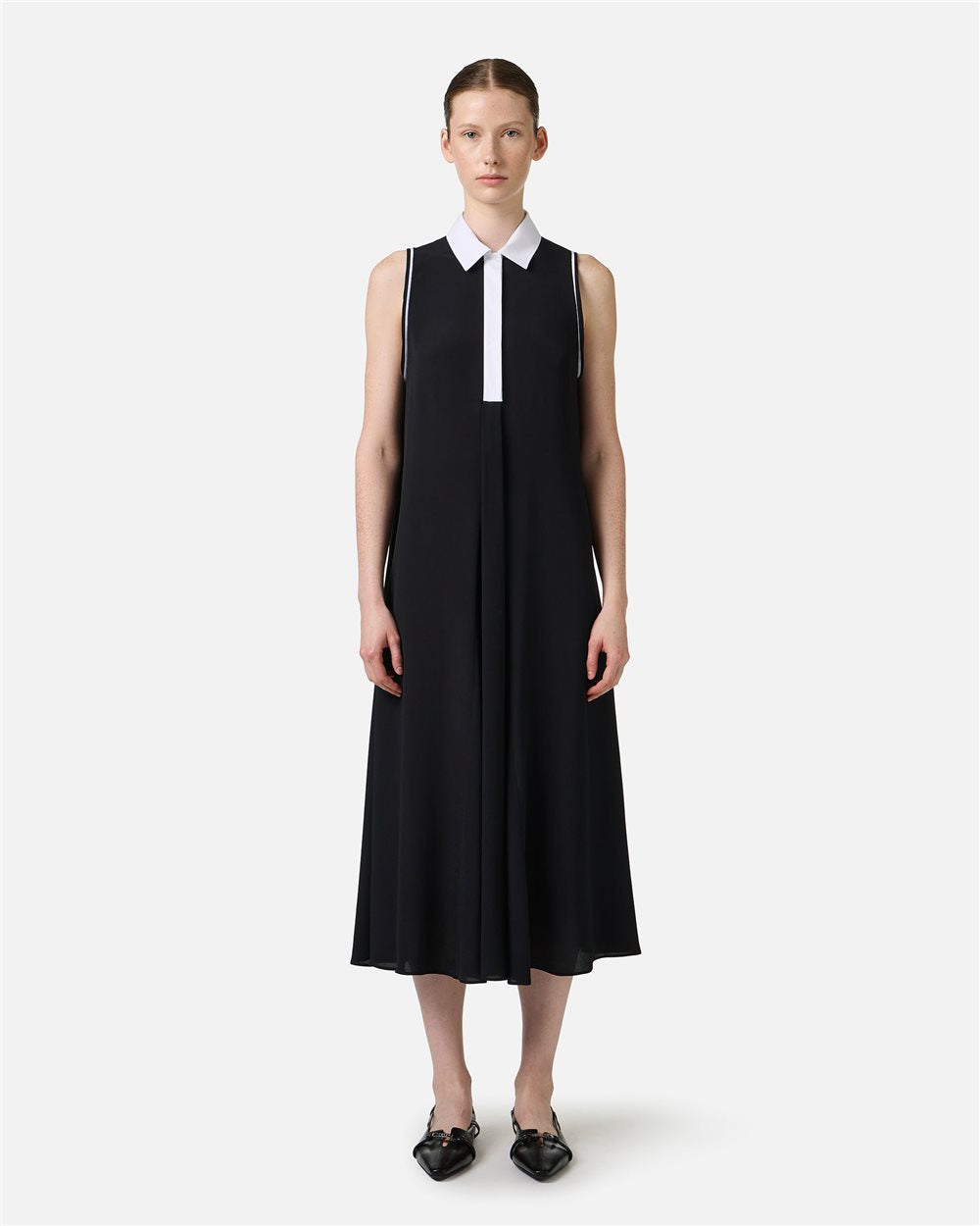 Vestido sem mangas de corte solto em crepe de chine de seda preta, com um toque de sofisticação. O modelo apresenta uma gola polo com botões em popeline branca, criando um elegante contraste de cores. O acabamento em viés contrastante nas cavas confere um toque de alfaiataria, enquanto a placa com o logo nas costas assina a peça discretamente. Um modelo versátil e moderno, ideal para expressar com estilo a elegância esportiva em qualquer ocasião.