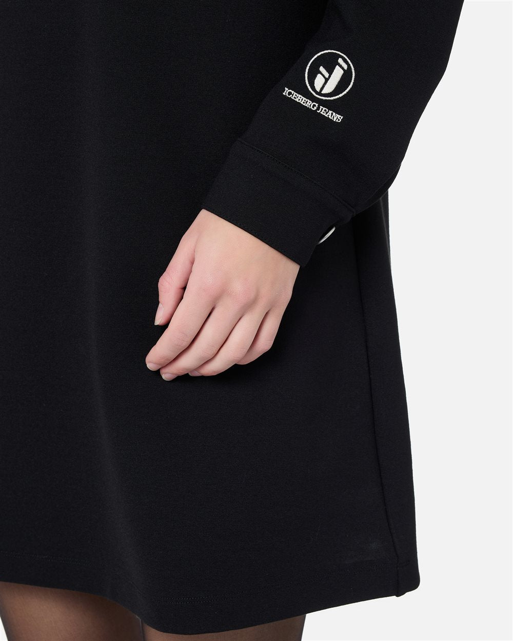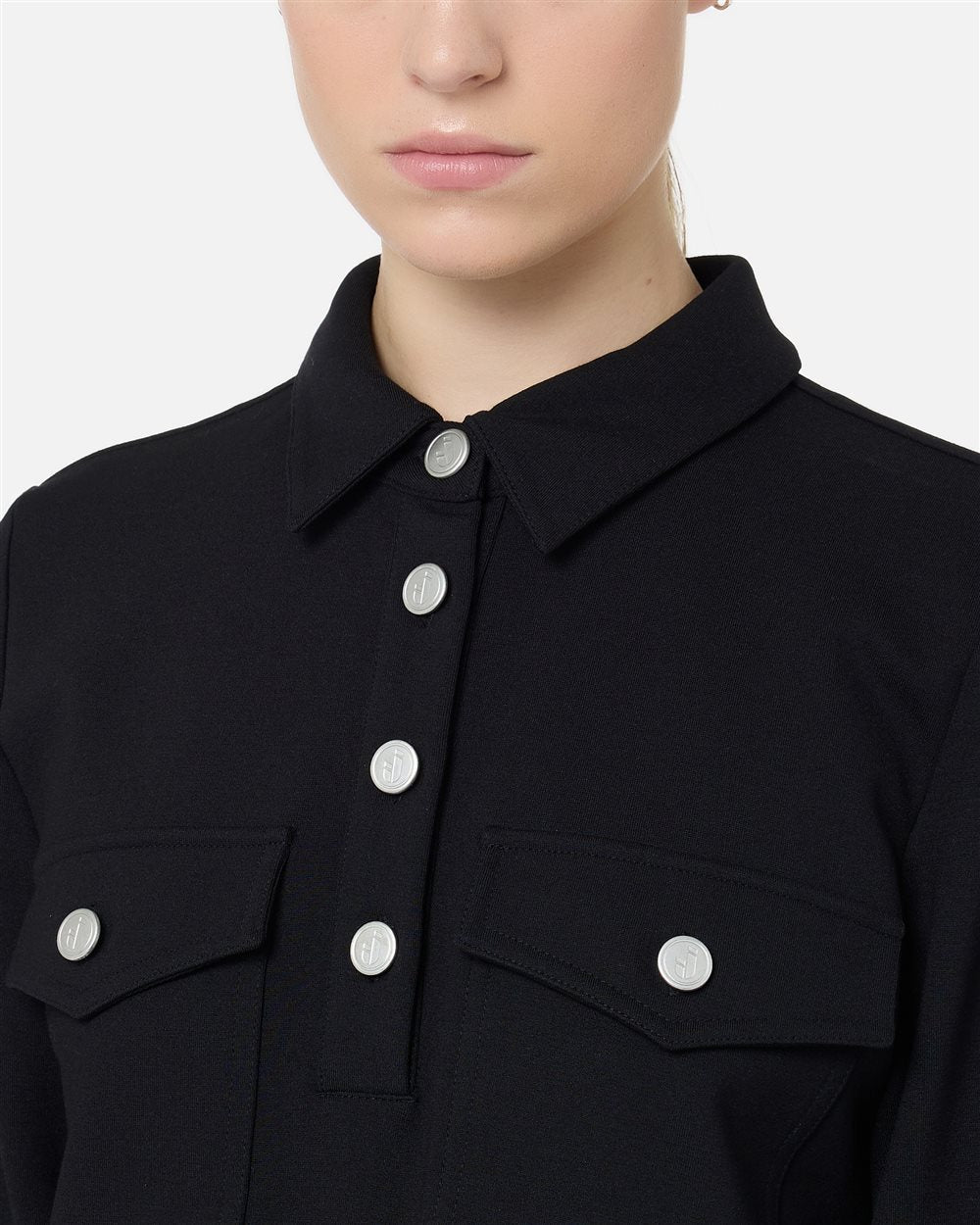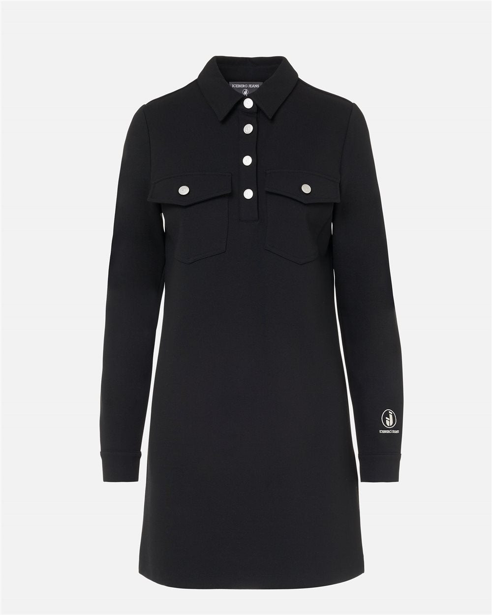 Linhas elegantes e um toque esportivo definem este minivestido preto em tecido Milano stretch com modelagem polo. A carcela, as lapelas dos bolsos no peito e os punhos são finalizados com botões de pressão com o logotipo, enquanto o bordado com o logo IJ no punho esquerdo define discretamente a peça. Uma combinação de elegância funcional e identidade gráfica típica da Iceberg.