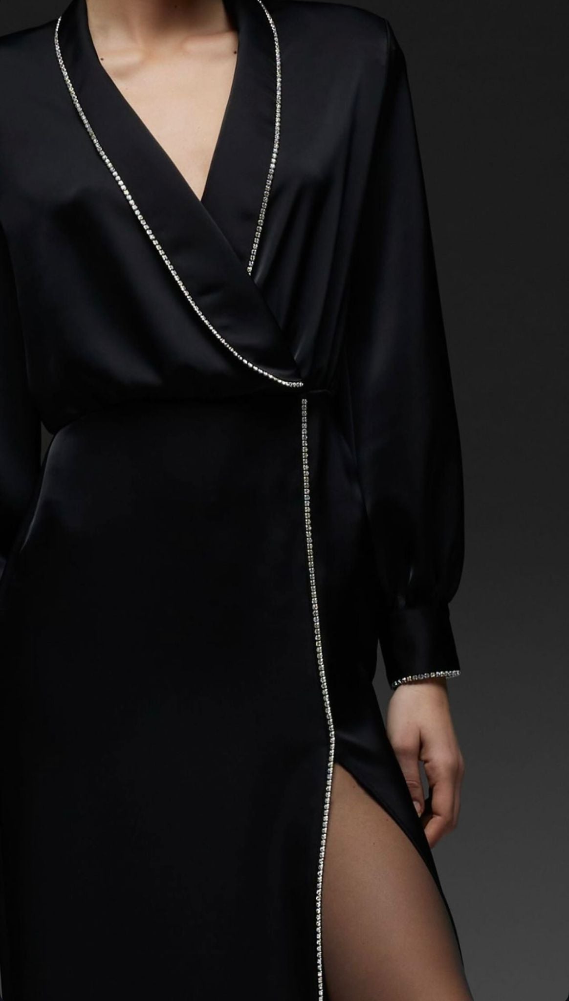 Vestido Party Edition. Vestido longo acetinado, de mangas cumpridas e detalhe de brilhos ao longo das costuras.