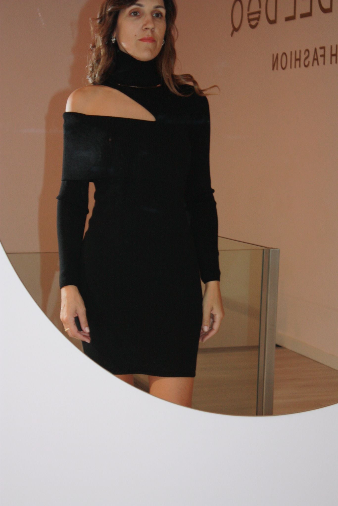 Vestido em malha Simona Corsellini, decote no ombro, gola alta com acessório em dourado.