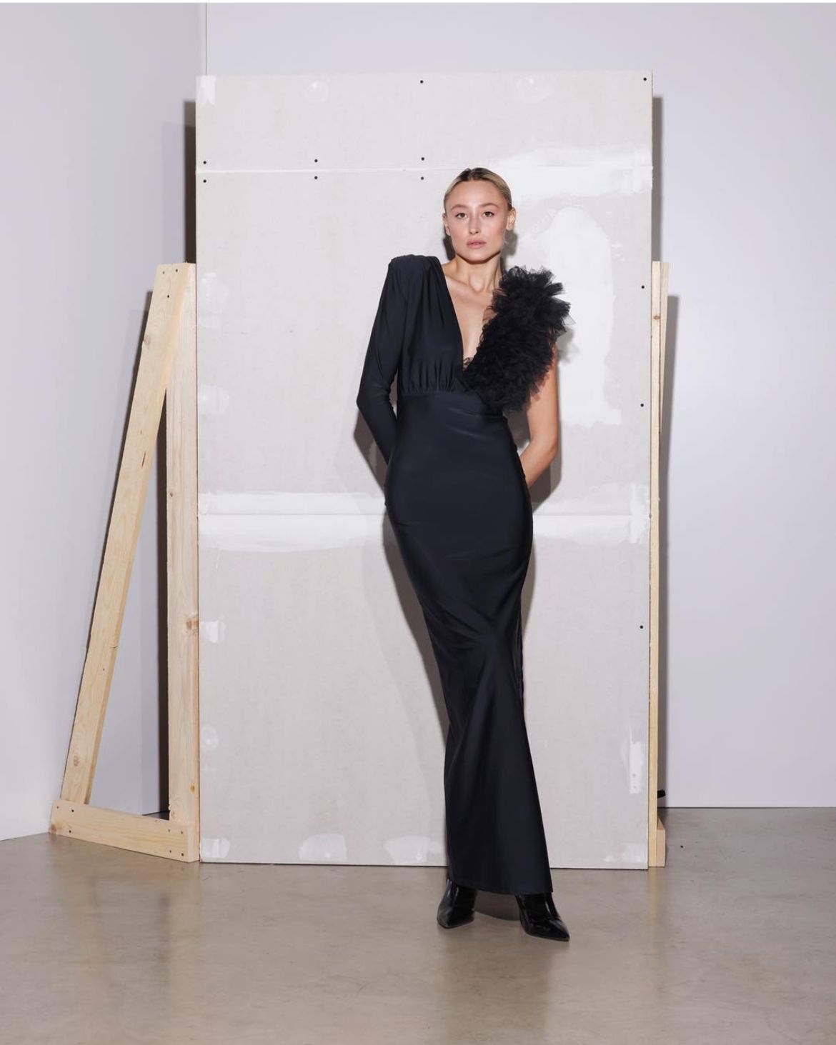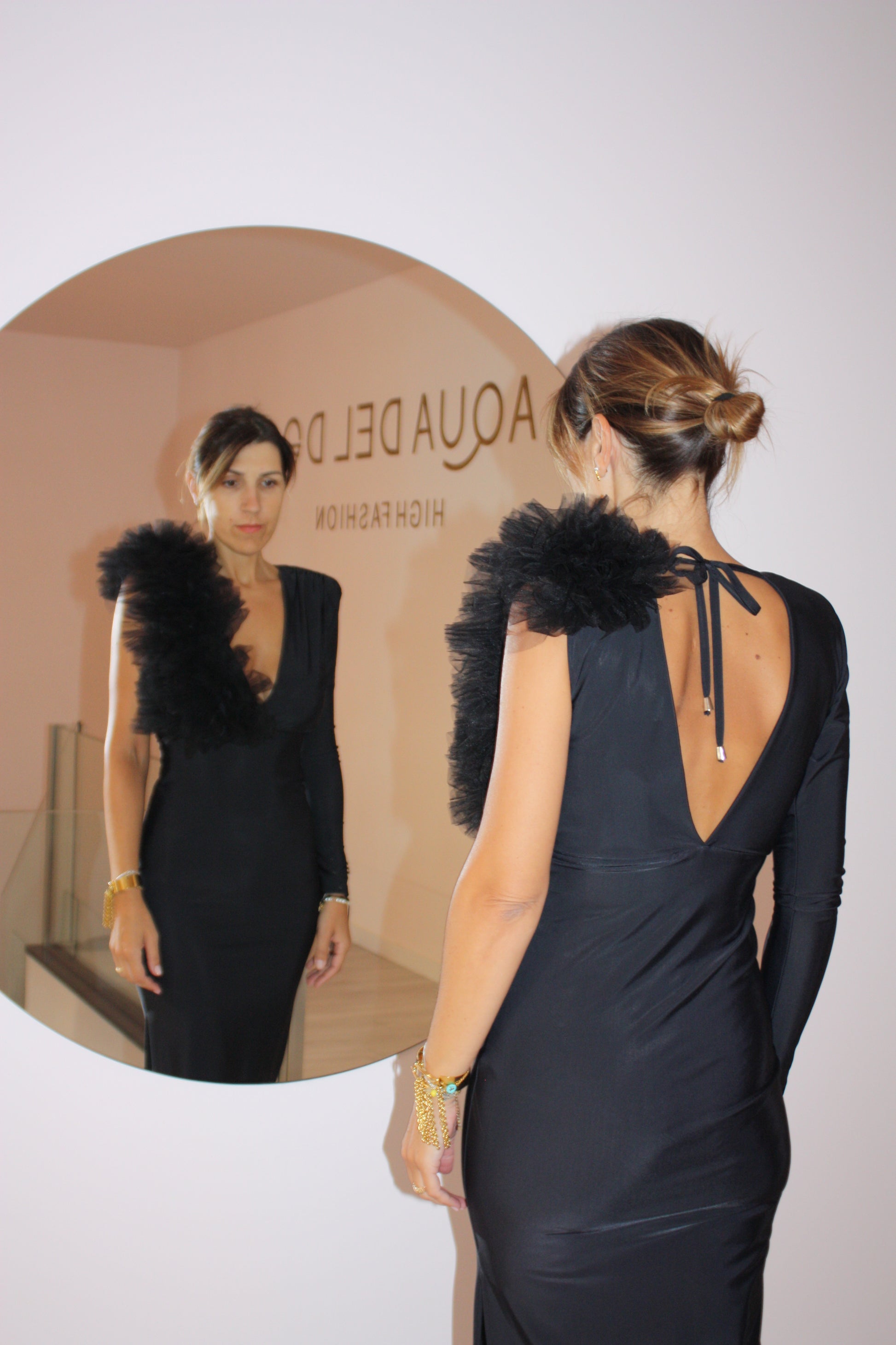 Vestido preto maxi, com racha lateral, uma manga, decote em V e tule no ombro esquerdo.