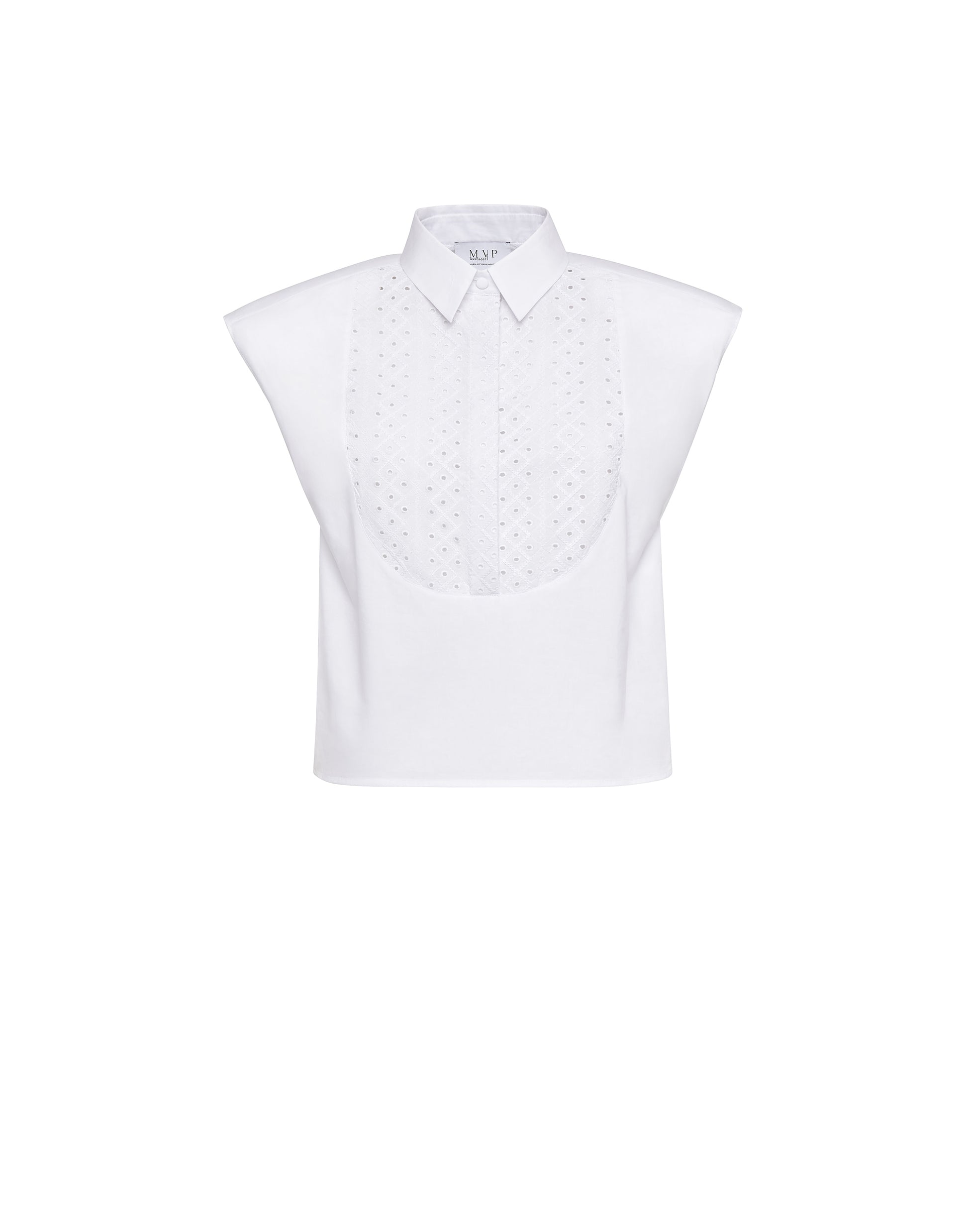 Camisa de popeline sem mangas, corte oversized, alças quadradas e detalhe de bordado inglês na em frente. Fechamento com botões ocultos no centro.
